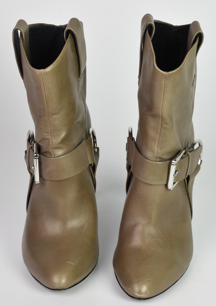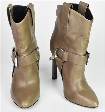 Tronchetto in vera pelle color tortora con dettaglio in metallo. Tacco di 11 cm. Taglia 7. Lievi segni d’uso. Ben conservato.