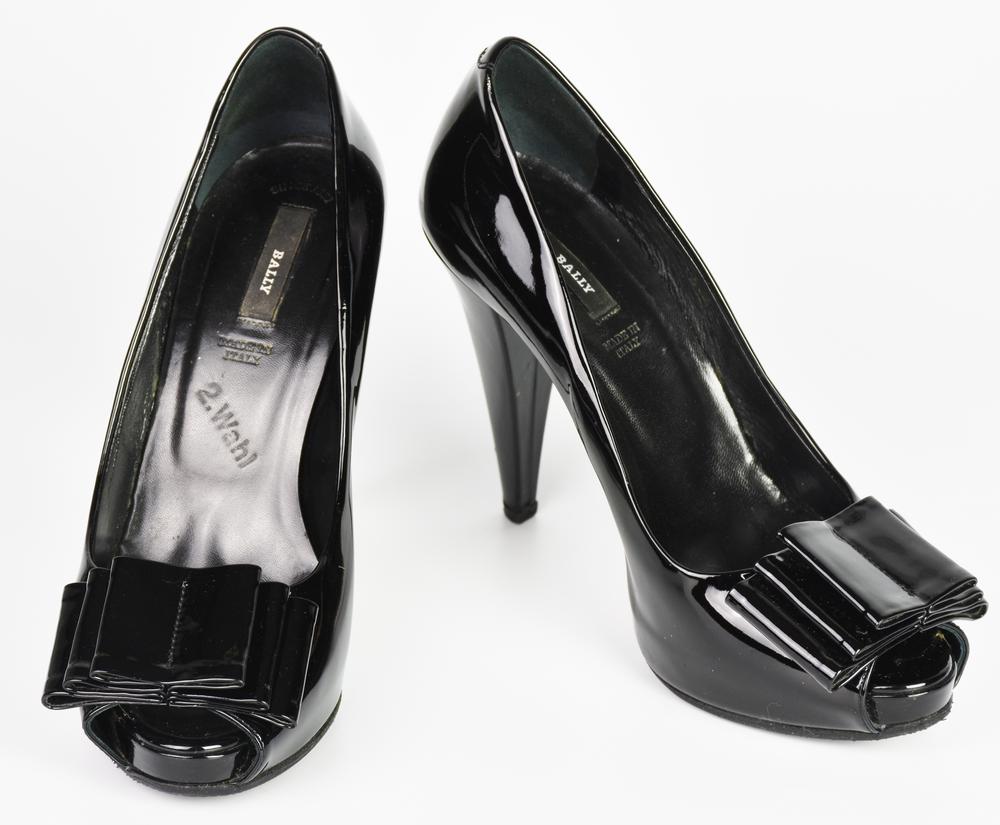 Bally OPEN TOE DESCRIPTION: Open toe black patent leather pumps with a bow at...