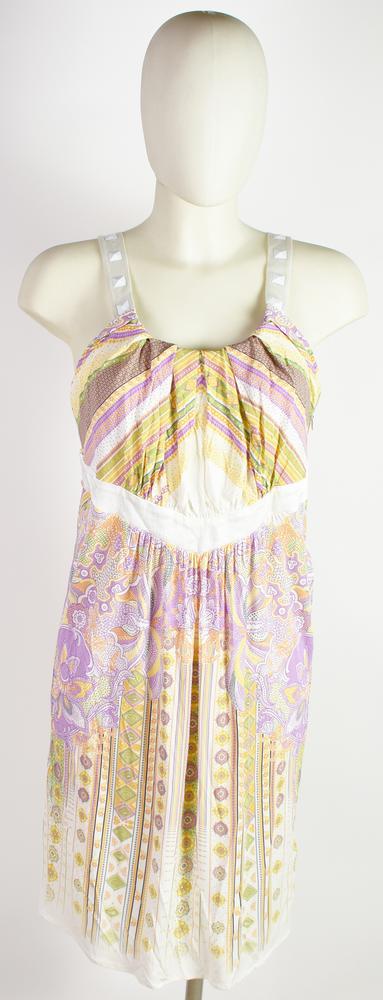 Abito stampato con borchie applicate sulle spalline e cerniera laterale. Taglia 46 IT. Prodotto in Romania. Perfettamente conservato.