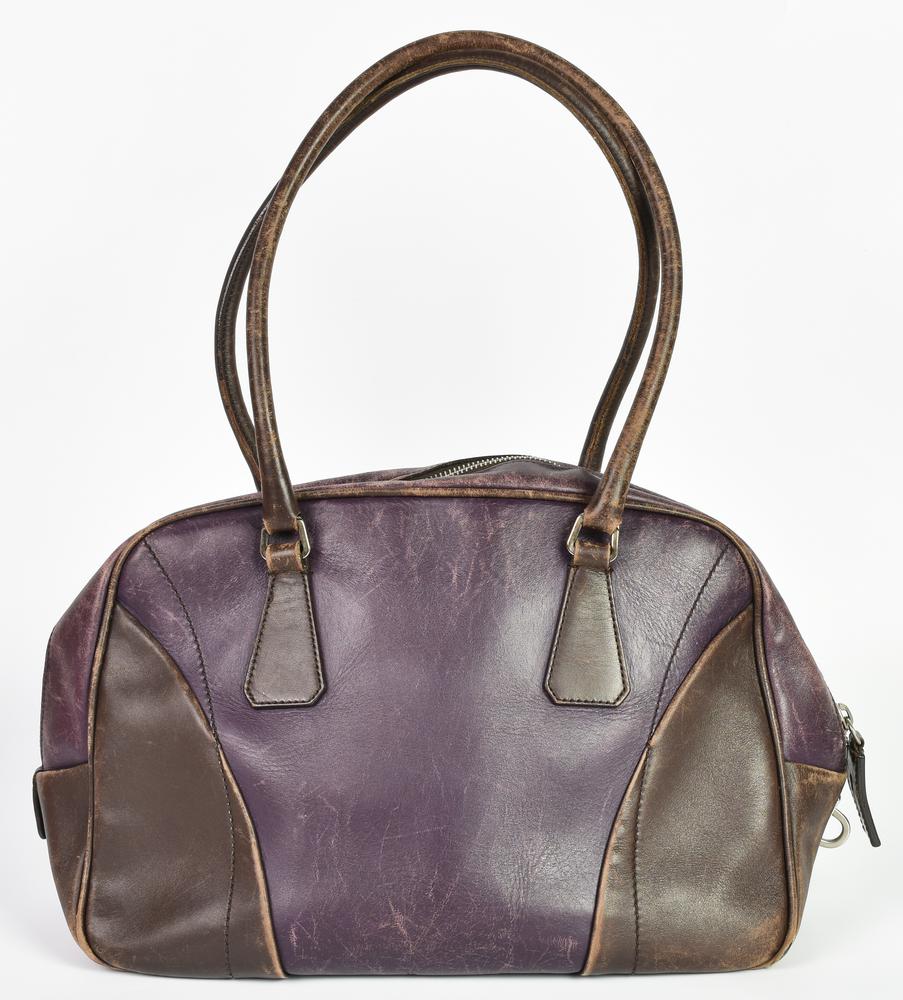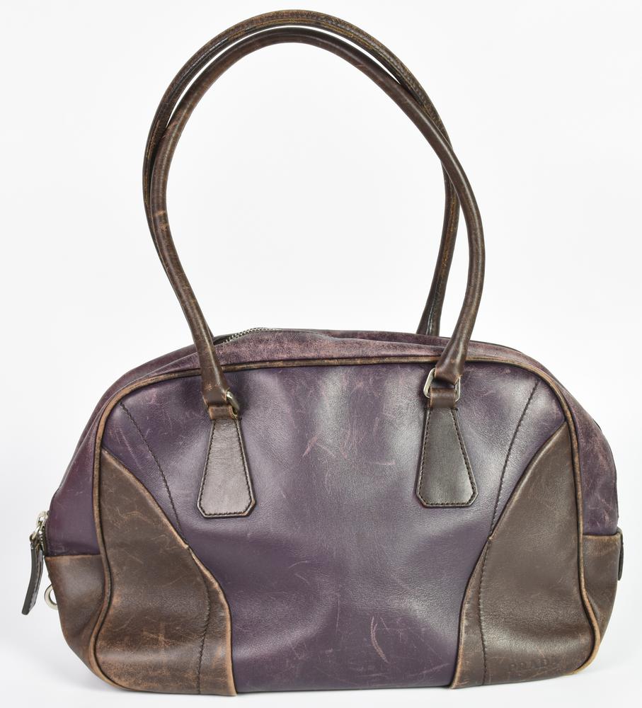 PRADA Borsa a mano modello Bowling Bag in pelle viola e marrone con doppio manico. Chiusura con cerniera. Interno in tessuto logato organizzato in un unico vano, con un taschino laterale con cerniera. Hardware in metallo cromato. Cm 31x20x12. Altezza coi manici cm 43. Difetti e mancanze. Discretamente conservata.