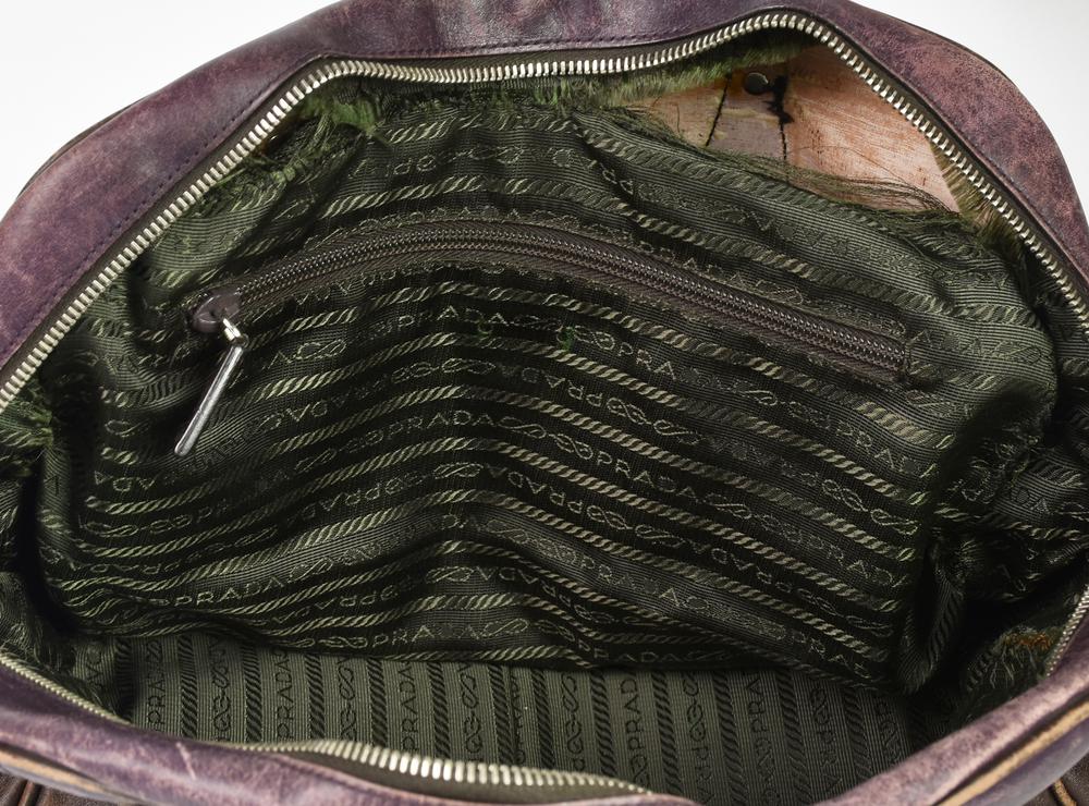 PRADA Bowling Bag handbag in purple and brown leather with double handle. Zipper closure. Logo fabric interior organized in a single compartment, with a side pocket with zipper. Chrome metal hardware. Dimensions 31x20x12 cm. Handle height 43 cm. Defects and deficiencies. Discretly preserved.