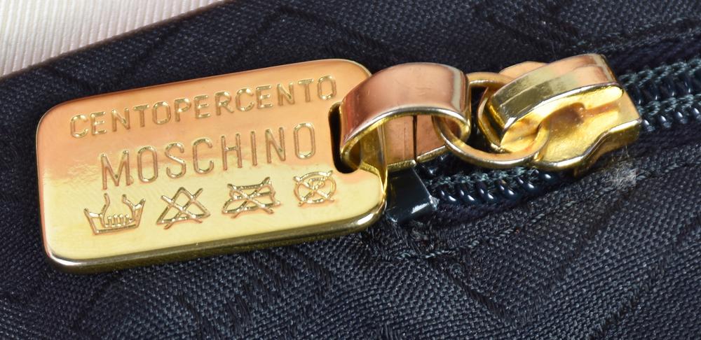 MOSCHINO BY REDWALL Borsa in tela modello shopper con manico rigido. Chiusura con cerniera. Interno organizzato in un unico vano con un taschino laterale con cerniera. Hardware in metallo dorato. Cm 40,50x33x7. Altezza coi manici cm 43,50. Codice riferimento prodotto 433130. Prodotto in Italia. Difetti e mancanze. Discretamente conservata.