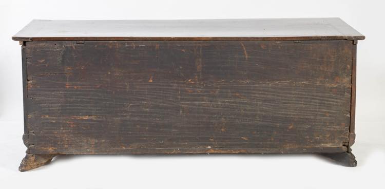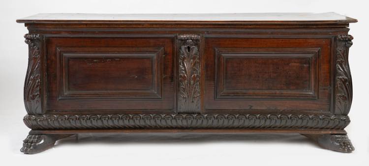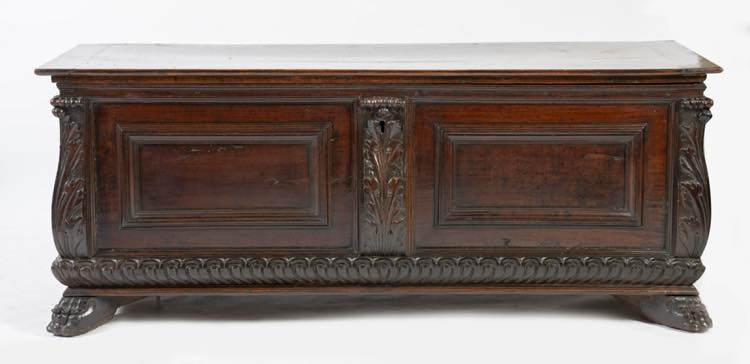 Manifattura lombardoveneta, XVII secolo. Cassapanca in massello di noce.