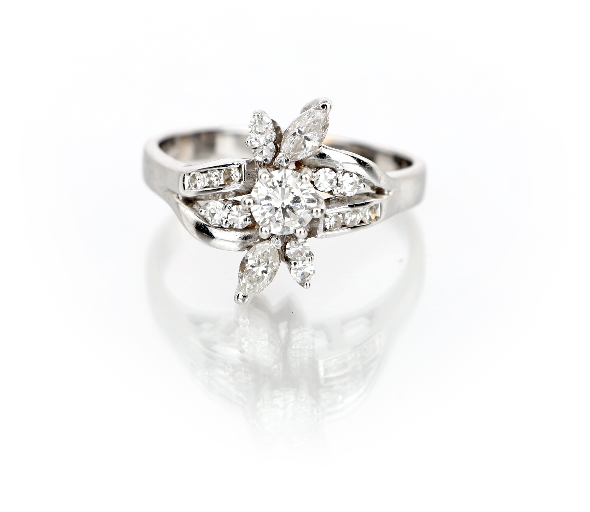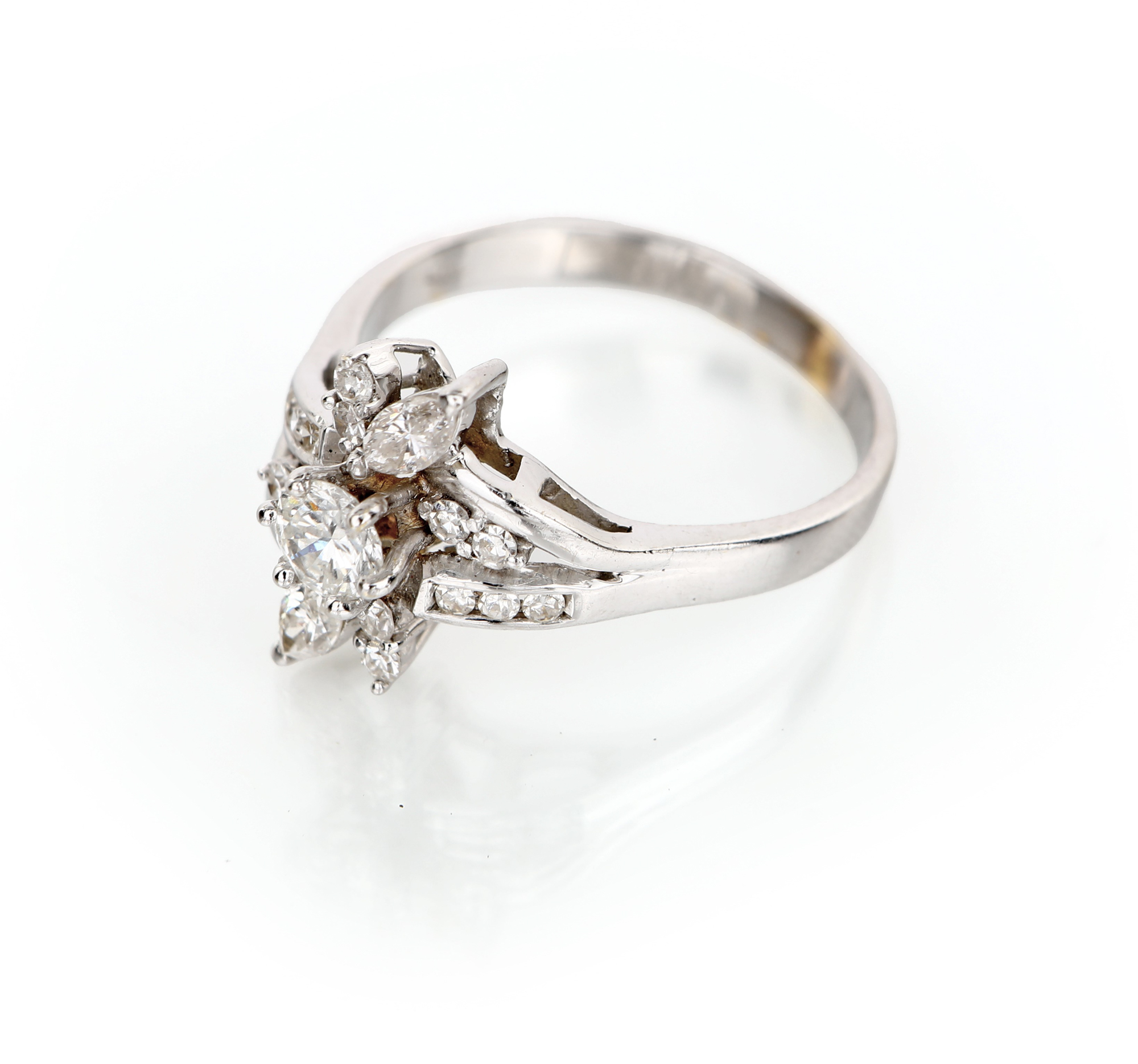 Anello in oro e brillanti Oro bianco 750/000. Diamante in taglio rotondo brillante centrale ct. 0,20 e diamanti in taglio rotondo brillante e navette. Peso complessivo gr. 4,70 Misura 16