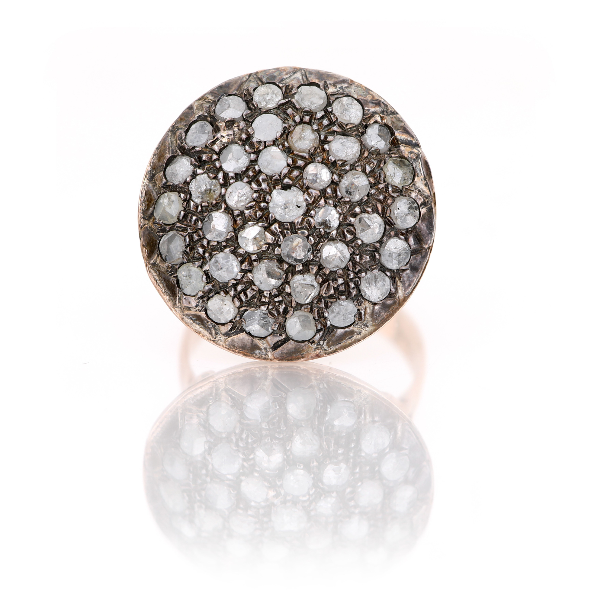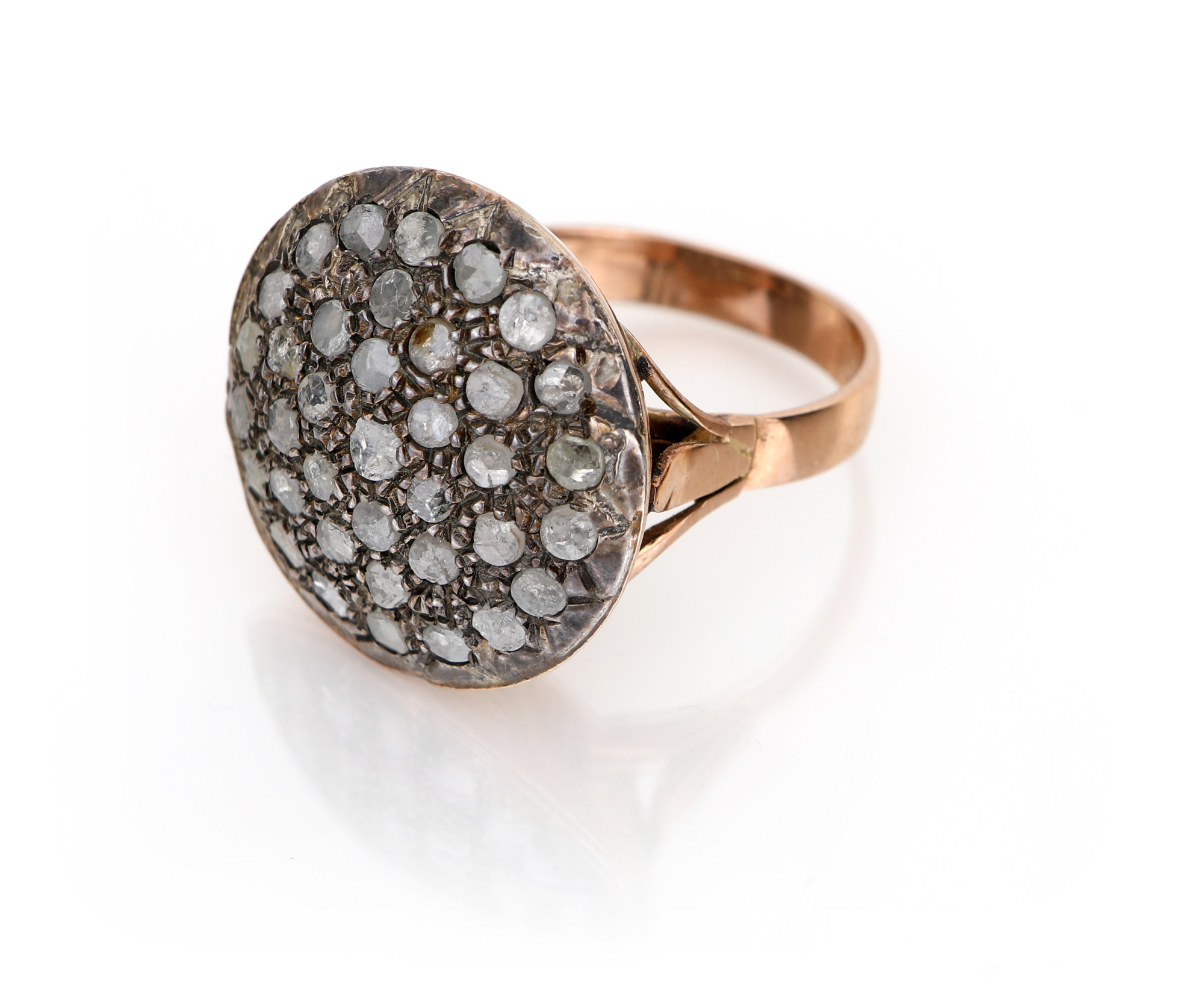 Anello a toppa in oro, argento e diamanti Oro a basso titolo, argento, diamanti in taglio rosa. Peso complessivo gr 8,30 Misura 14