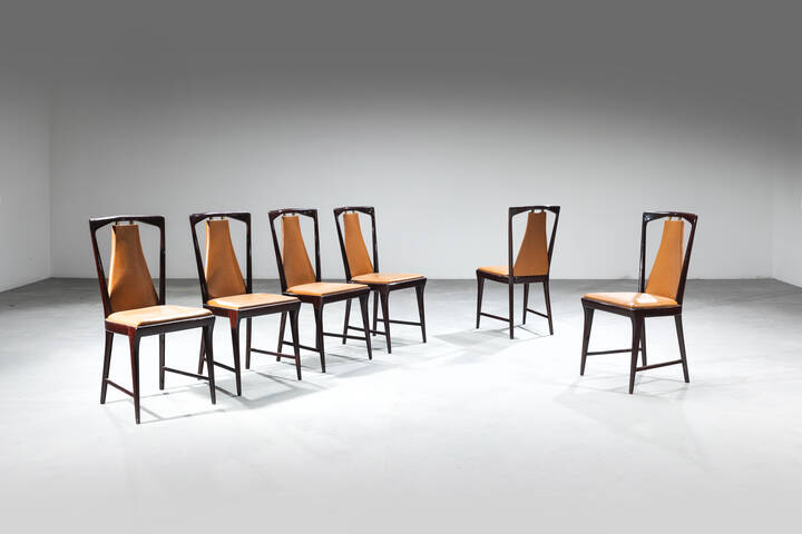 Struttura e sostegni in legno, rivestimento in skai e particolari in ottone.