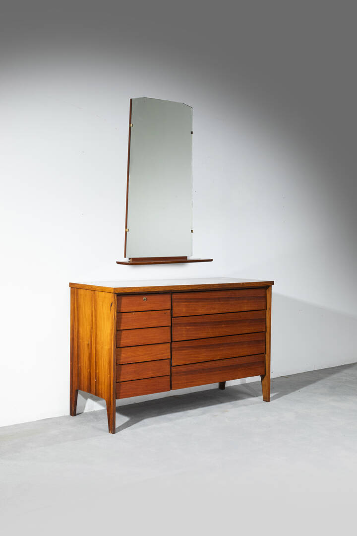 Cassettiera in legno con specchio in legno, vetro specchiato e particolari in ottone.