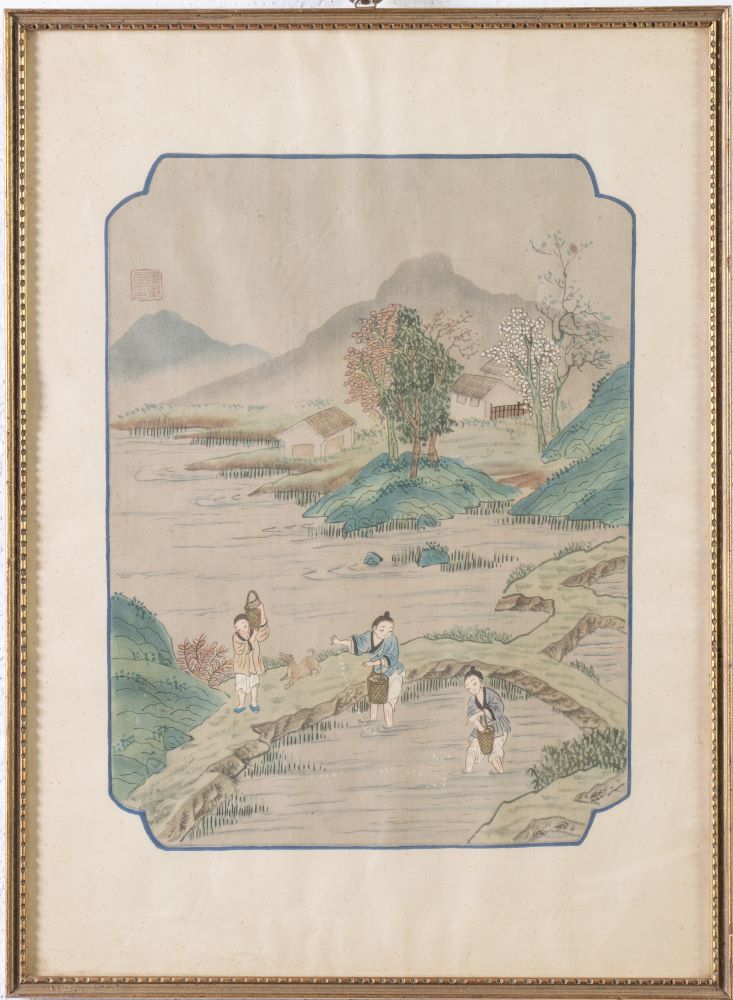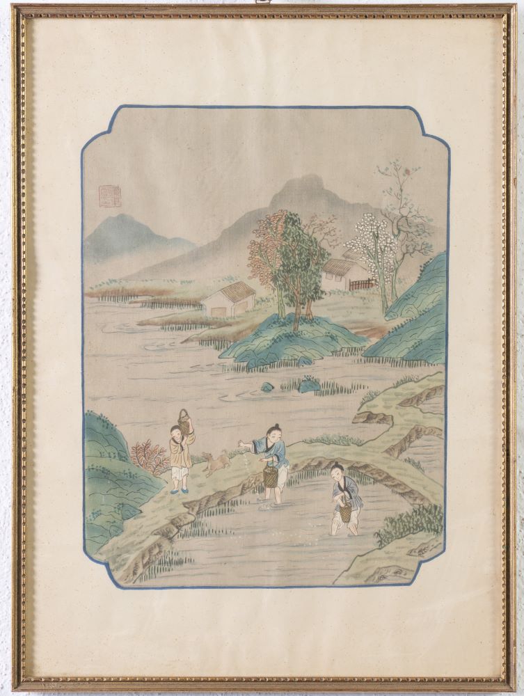 Stampa su carta raffigurante paesaggio con personaggi, Cina, XX secolo. Con cornice e vetro. Cm. 32x24.
