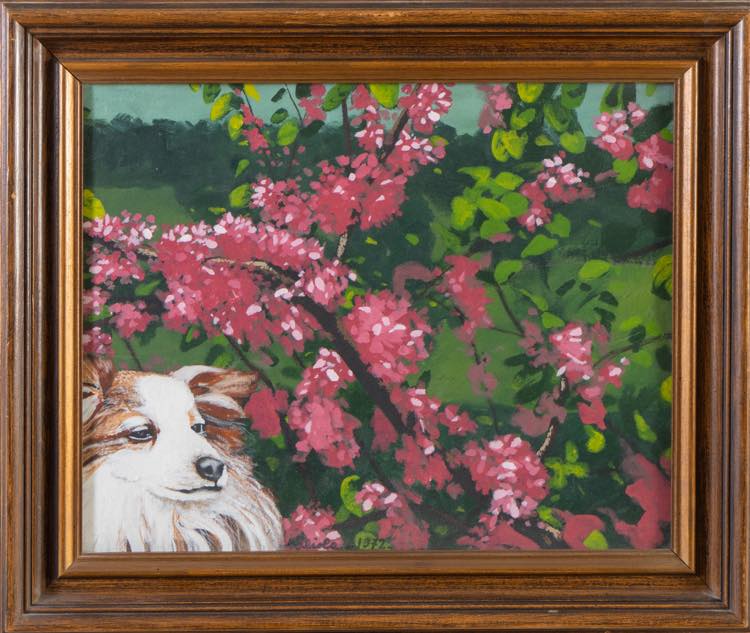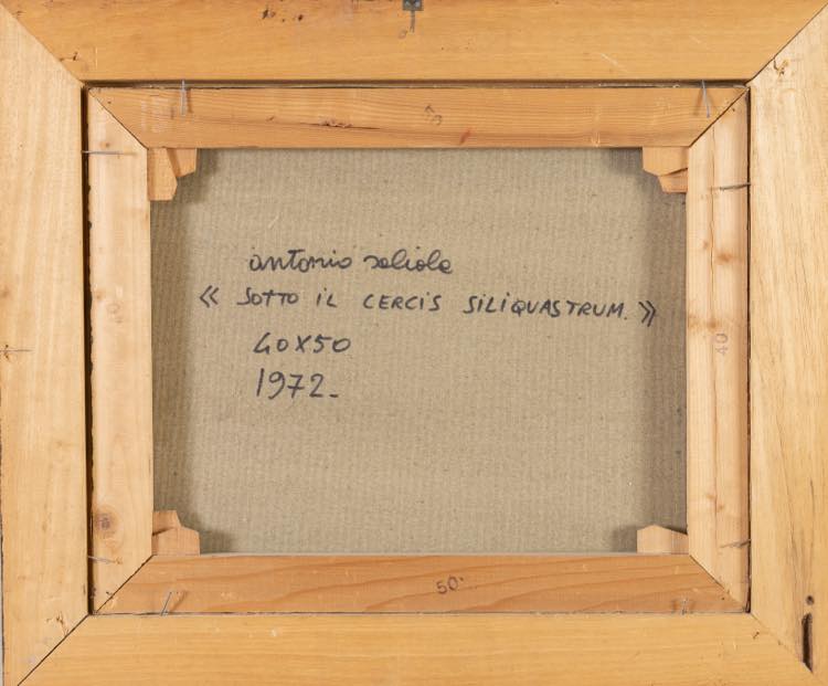 Antonio Saliola (Bologna 1939). Sotto il cercis siliquastrum, 1972. Olio su tela. Fimato e datato in basso a destra Saliola 1972. Al verso fiirmato, titolato e datato Antonio Saliola, Sotto il cercis siliquastrum, 1972. Cm. 40x50.
