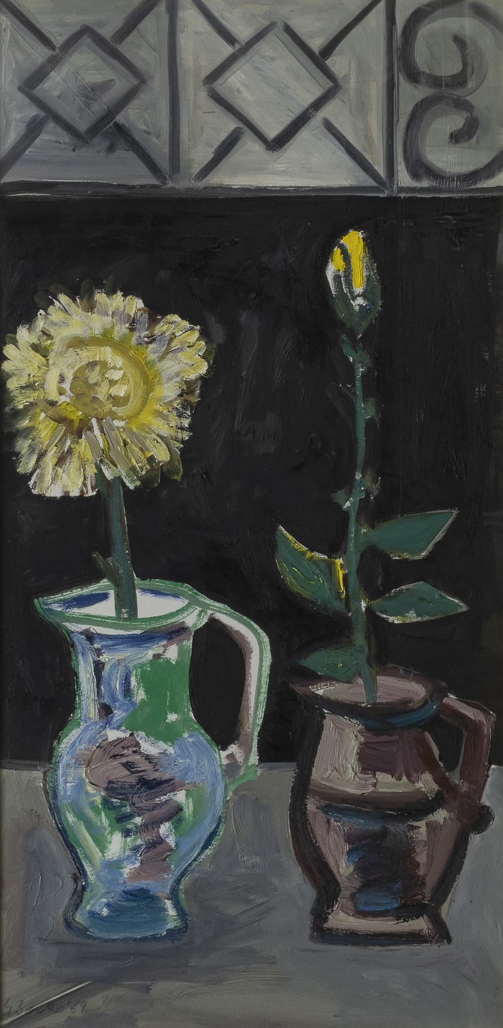 Vasi con fiori di carciofo e rosa gialla, 1969