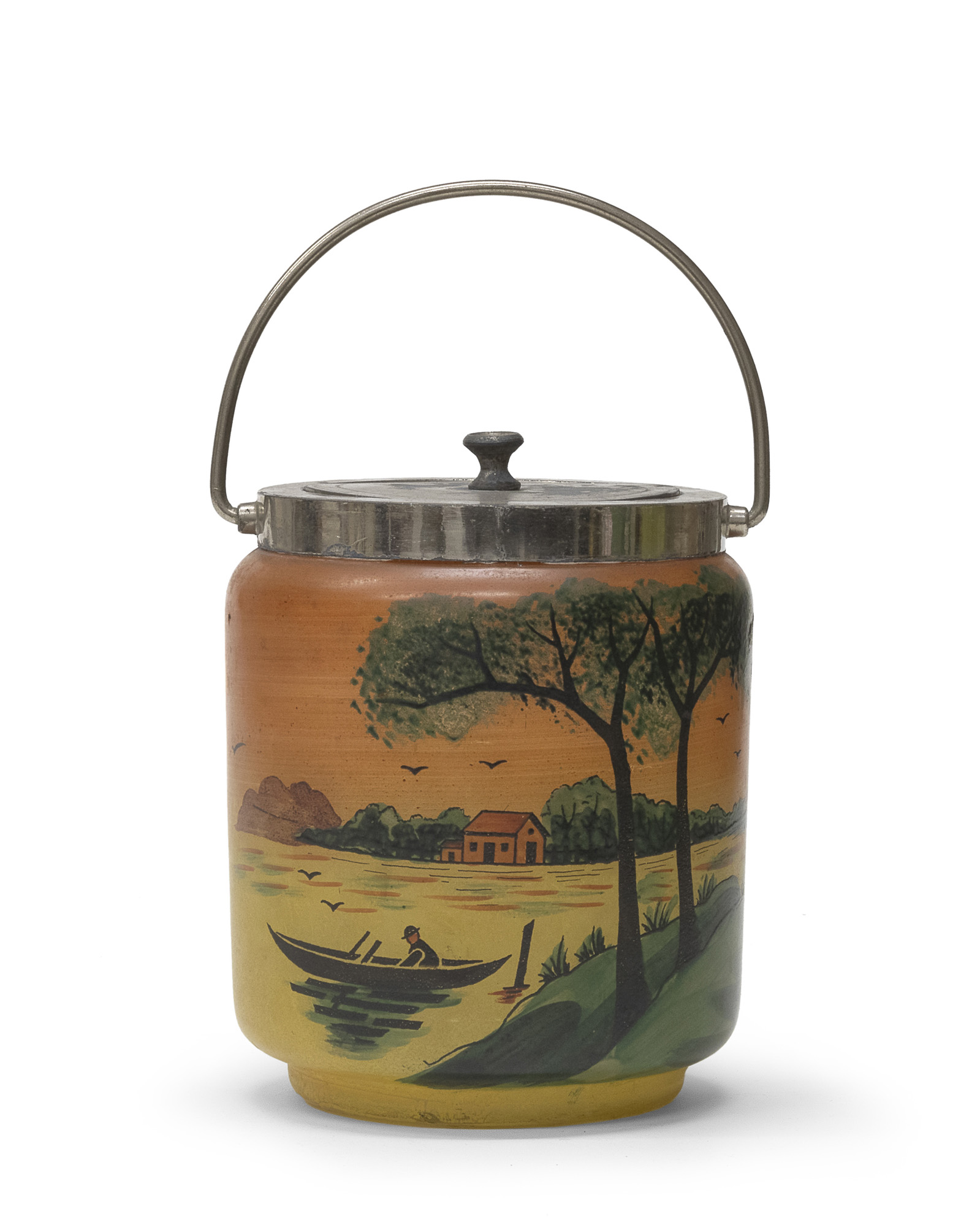 in pasta di vetro, decorato a mano a paesaggio. Coperchio di metallo cromato.