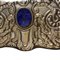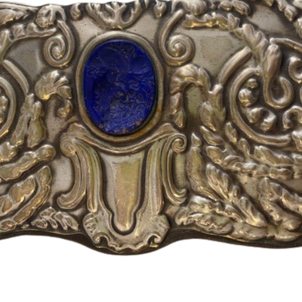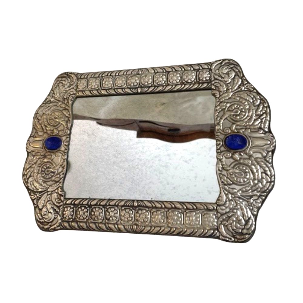 Vassoio svuotatasche. Con bordo in argento 800 sbalzato. Incastonati due ovali in pasta di vetro incisi nei toni del colore cobalto. Cm. 30x27.