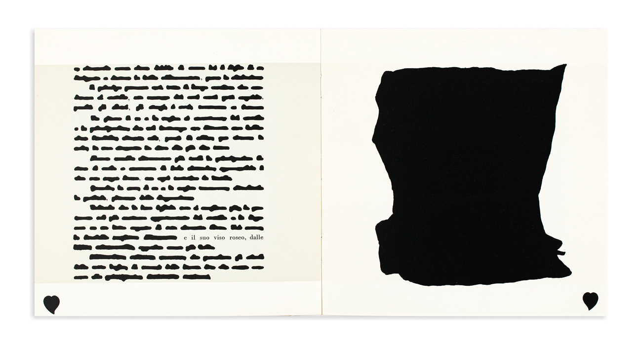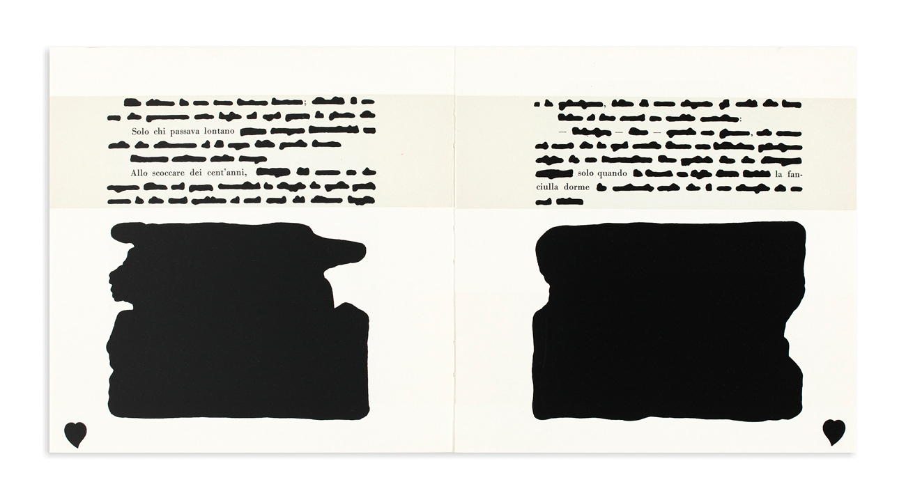 Folder contenente un libretto illustrato con l'omonima favola cancellata da Emilio Isgrò