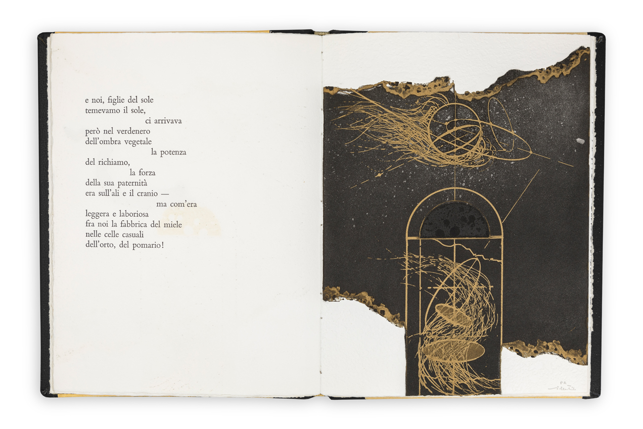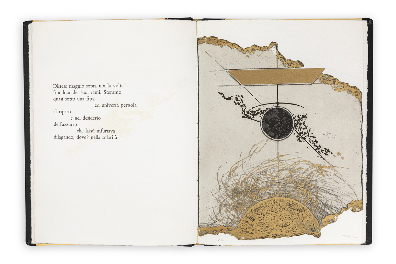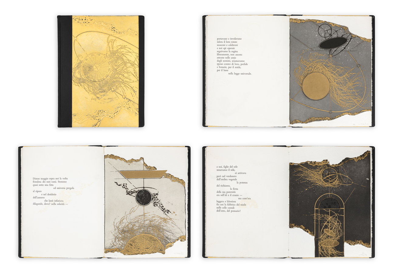 Splendida edizione d'arte, realizzata su carta fatta a mano della Cartiera Sicars di Catania, recante introduzione di Marco Marchi e una poesia inedita di Mario Luzi illustrata da 3 acqueforti, con elementi incisi e calcografici, di Walter Valentini, ciascuna recante firma e numerazione (Esemplari P.A.) a matita al fronte