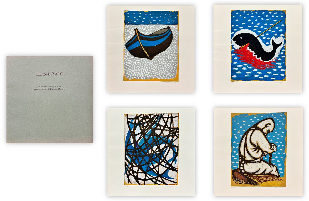 Cartella contenente racconto inedito di Luigi Cavallo e 4 serigrafie di Giuseppe Migneco, ciascuna recante firma e numerazione (Esemplari 26/120) a matita al fronte