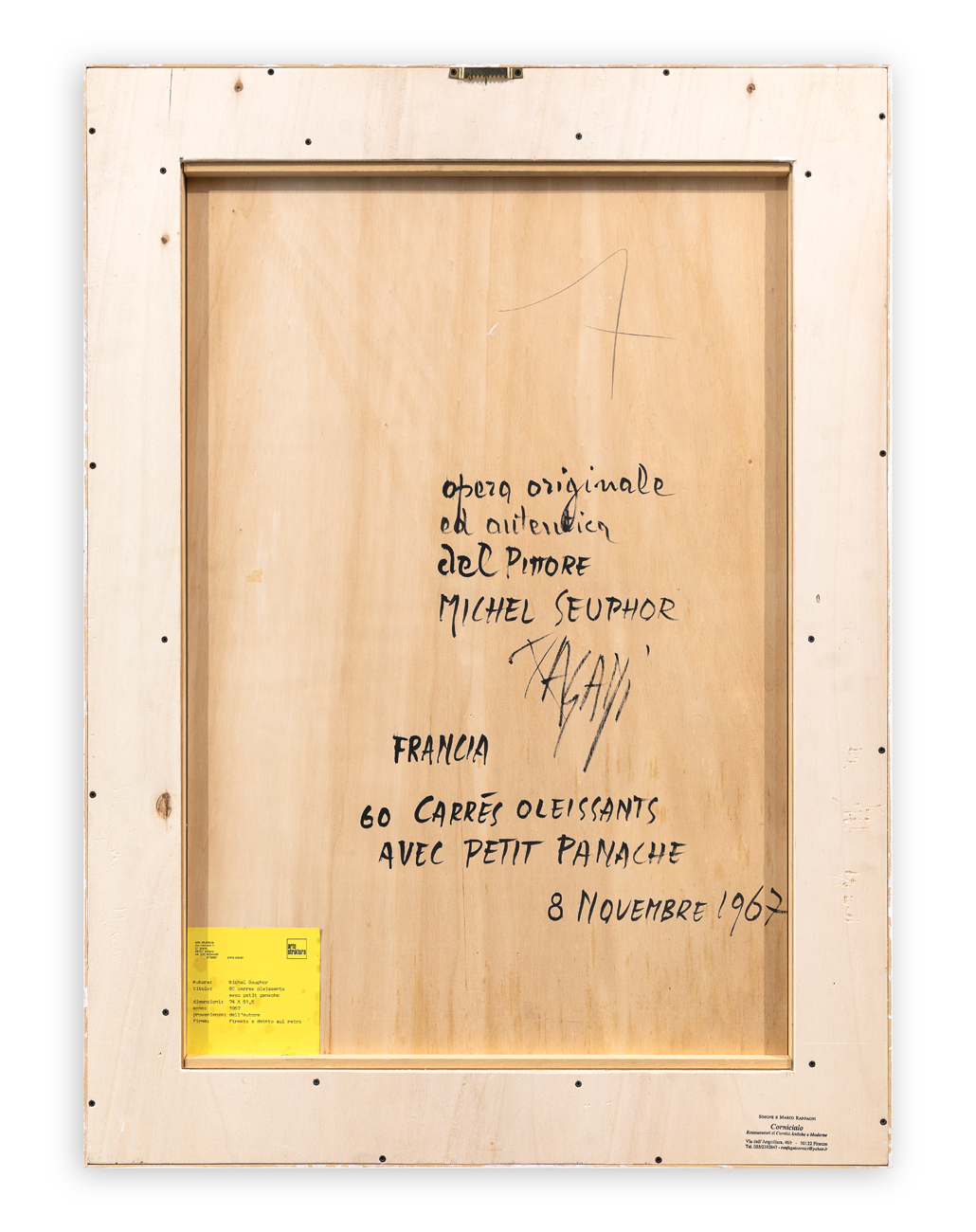 Firma e dichiarazione di autenticità e provenienza del Gallerista Pagani al retro della tavola protettiva