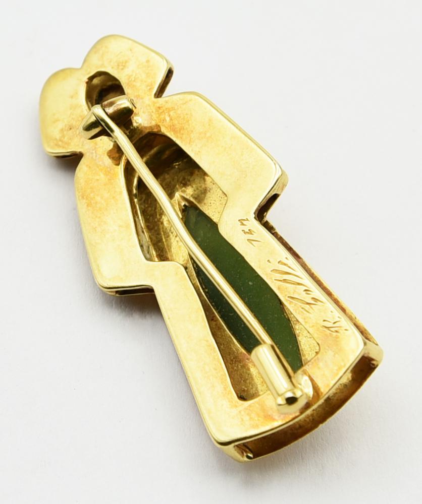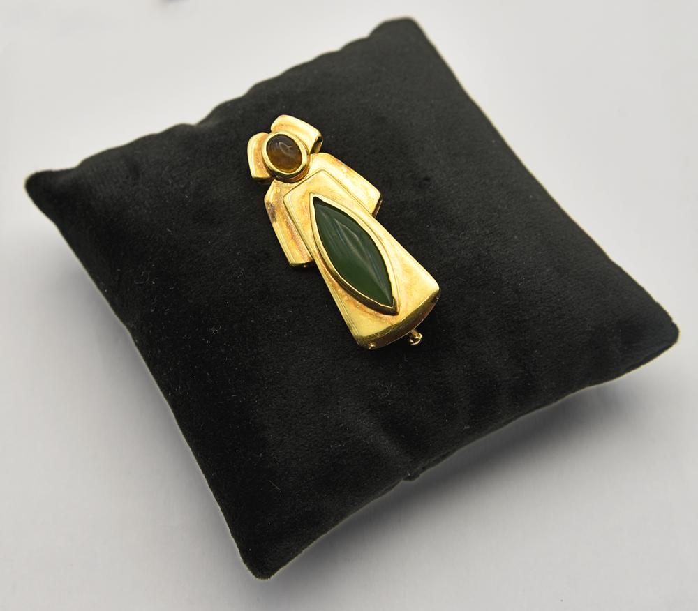iconica spilla a forma di bambola in oro giallo con incastonato un calcedonio di forma navette e un quarzo citrino di forma ovale