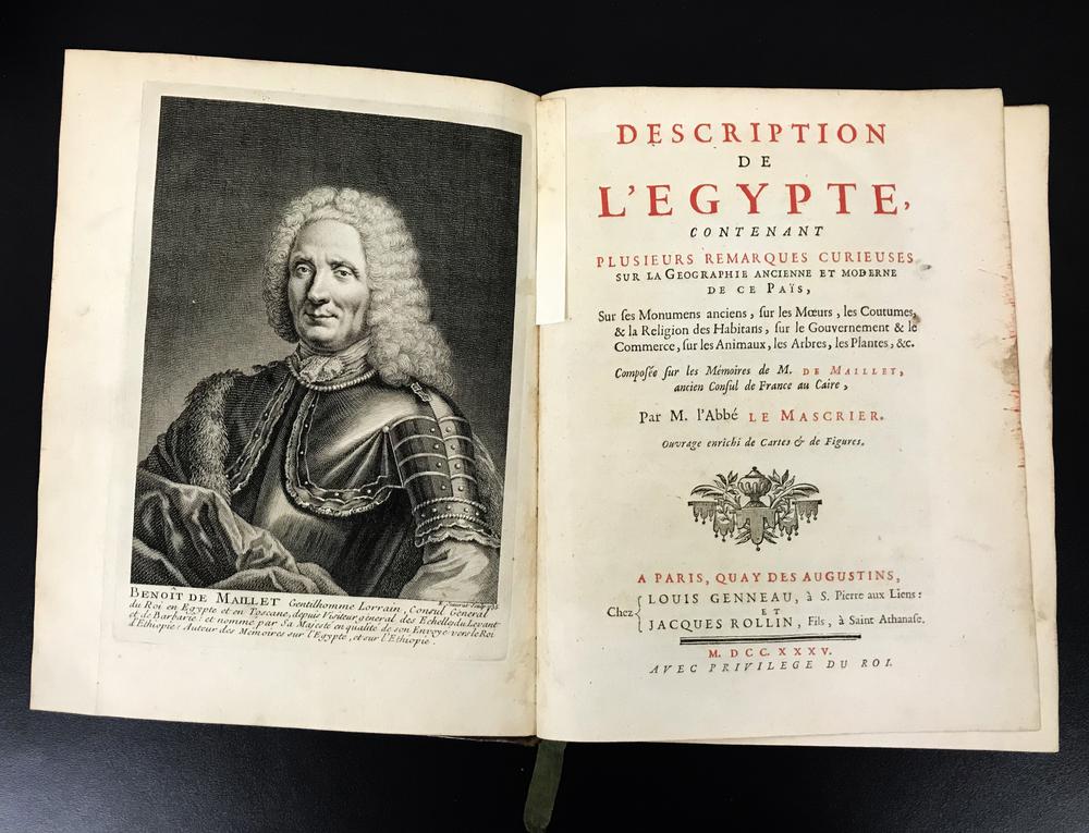 contenant plusieurs remarques curieuses sur la Geographie ancienne et moderne de ce Pais, sur ses Monumens anciens, sur les Moeurs, les Coutumes, e la Religion des Habitans, sur le Gouvernement e le Commerce, sur les Animaux, les Arbres, les Plantes, etc. Composee sur les Memoires de M. de Maillet, ancien Consul de France au Caire. A Paris, Chez Louis Genneau et Jacques Rollin, 1735
