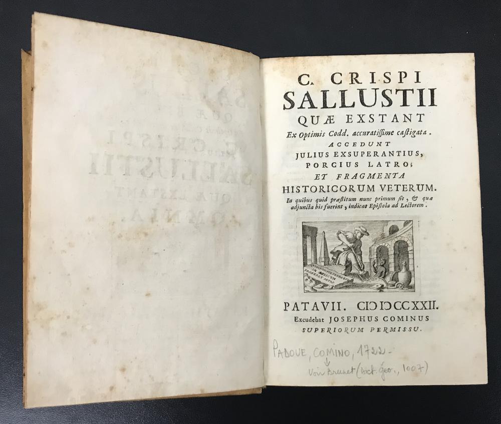 C. CRISPI SALLUSTII QUAE EXSTANT EX OPTIMIS CODD. ACCURATISSIME CASTIGATA. ACCEDUNT JULIUS EXSUPERANTIUS, PORCIUS LATRO ET FRAGMENTA HISTORICORUM VETERUM IN QUIBUS QUID PRAAESTITUM NUNC PRIMUM SIT & QUAE ADJUNCTA BIS FUERINT, INDICAT EPISTOLA AD LECTOREM. PATAVII, JOSEPHUS COMINUS, 1722