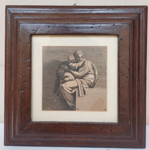 Giorgio Mantovano Ghisi (Mantova 1520 ca.- 1582). Incisione su carta, riproducente le figure nella lunetta in cui è affrescato il profeta Gioele, volta della Cappella Sistina, Roma. Da Michelangelo Buonarroti. Con cornice e vetro. Cm. 20x20. In cornice cm. 36,5x36,5.