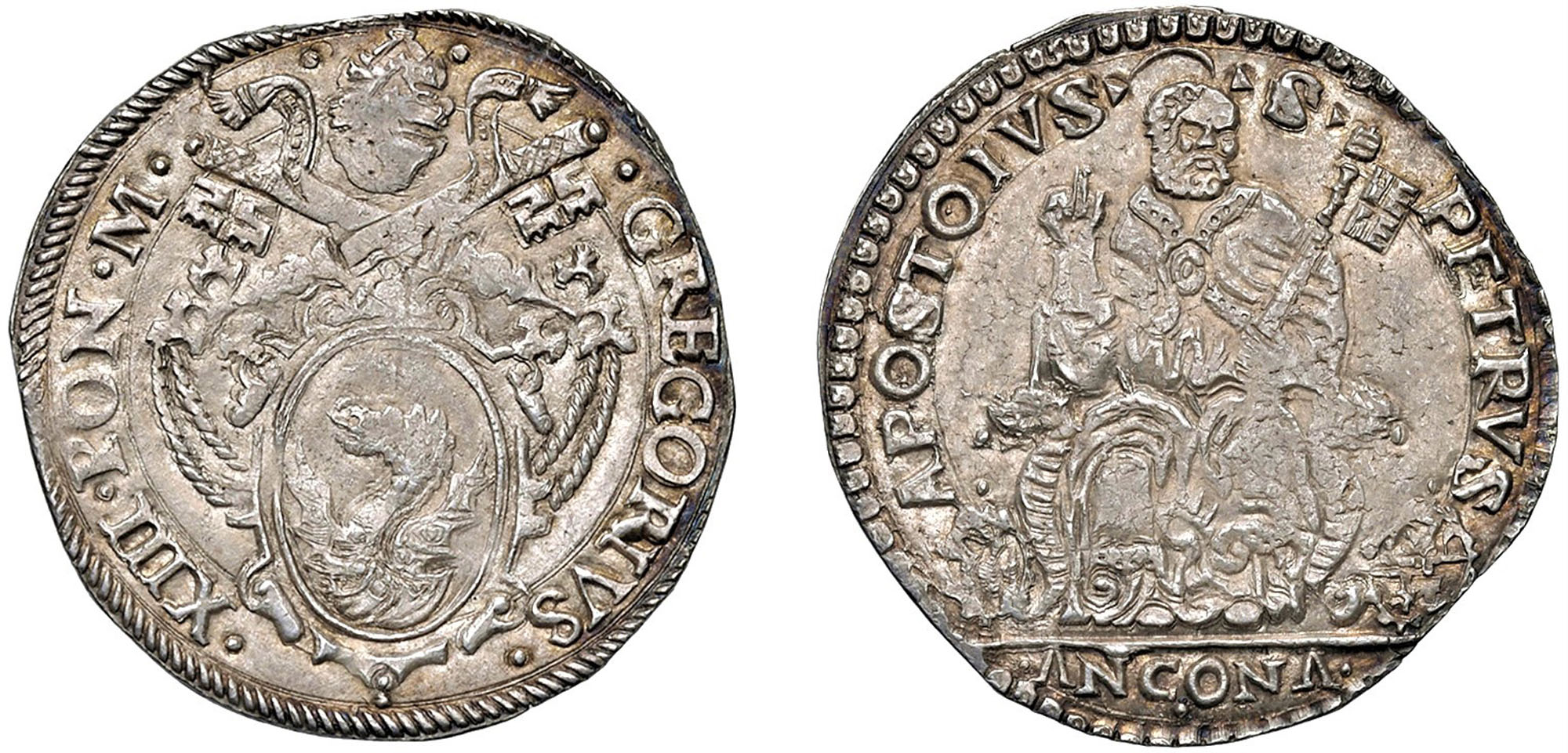 GREGORIO XIII, Ugo Boncompagni (1572-1585) - Testone s.d., AnconaArgento - 9,28 gr.Dritto: Stemma ovale in cornice a intagli e volute, sormontato da triregno e chiavi decussate; - Rovescio: San Pietro nimbato in trono i cui braccioli sono formati da due draghi.Muntoni 231Bell'esemplare con delicata patina di medagliere.SPL