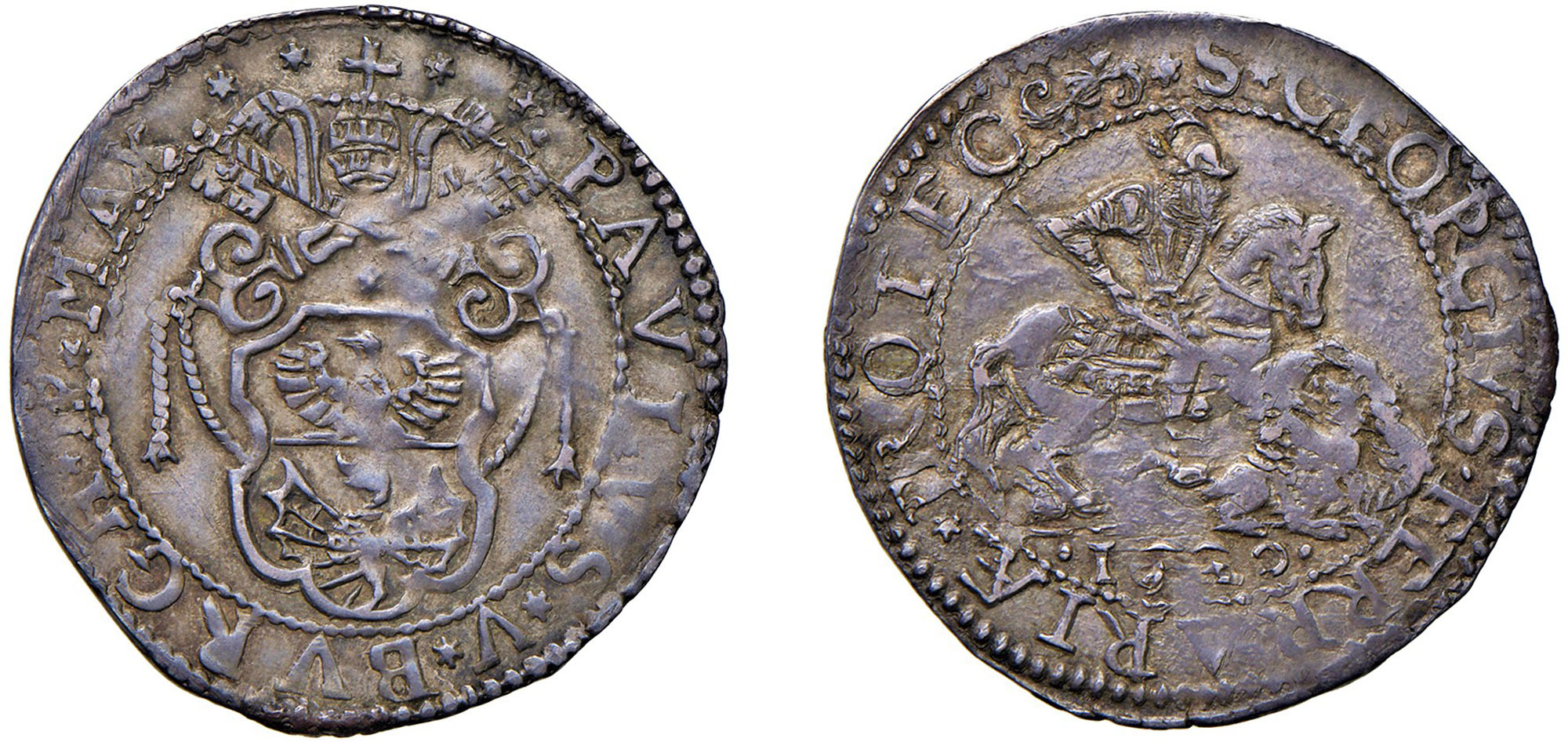 Dritto: Stemma a targa sagomata, sormontato da triregno e chiavi decussate; - Rovescio: San Giorgio, galoppante a destra, uccide un drago.