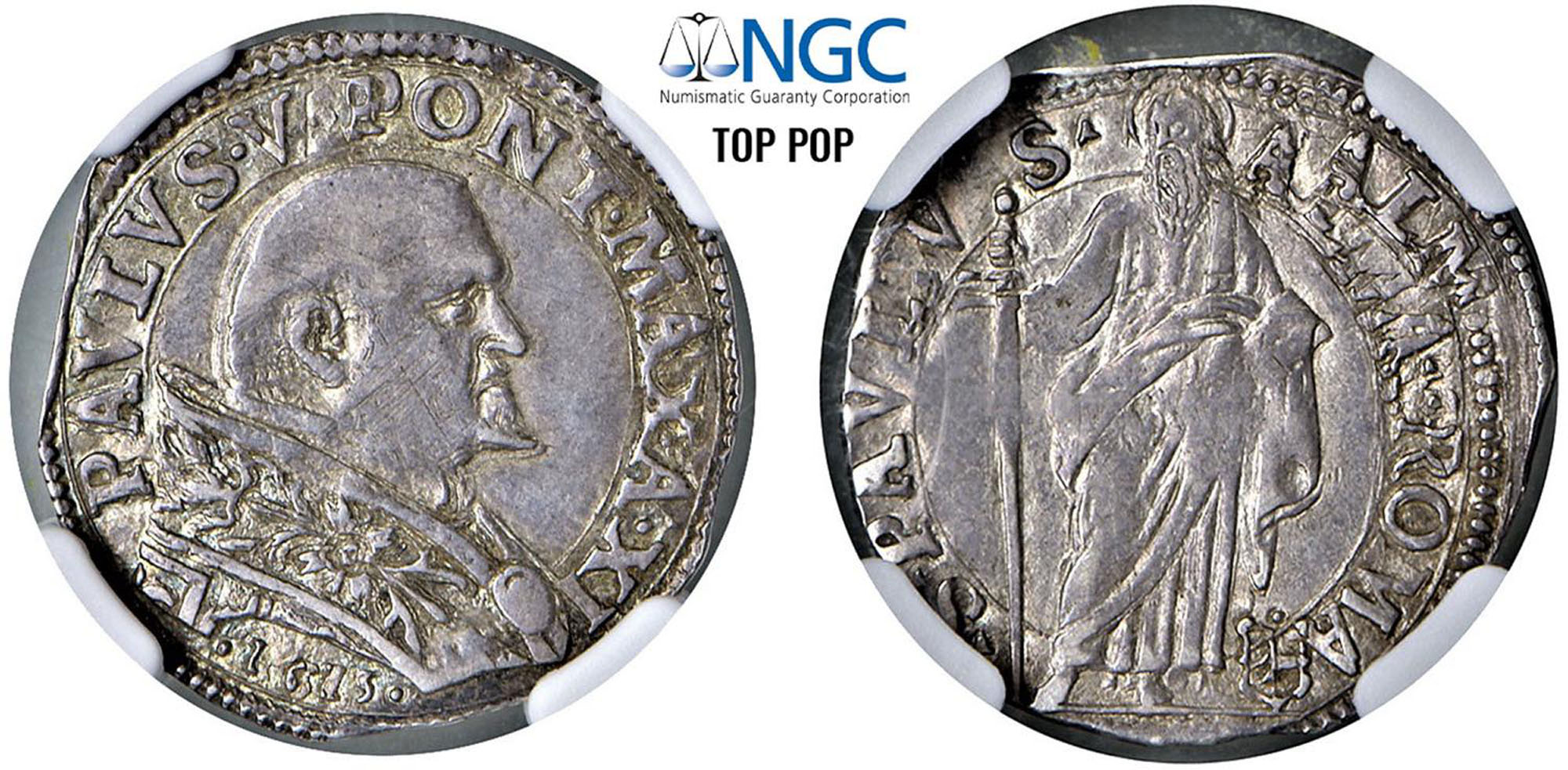 PAOLO V, Camillo Borghese (1605-1621) - Grosso 1615, an XI, RomaArgento - 1,41 gr.Dritto: Busto del pontefice a destra. - Rovescio: Figura di San Paolo con spadone puntato a terra e libro contro al petto.Muntoni 105Sigillato NGC AU55 - TOP POPCertificato NGC n. 2819819-006Ex CNG 106 del 13 settembre 2017, lotto 999