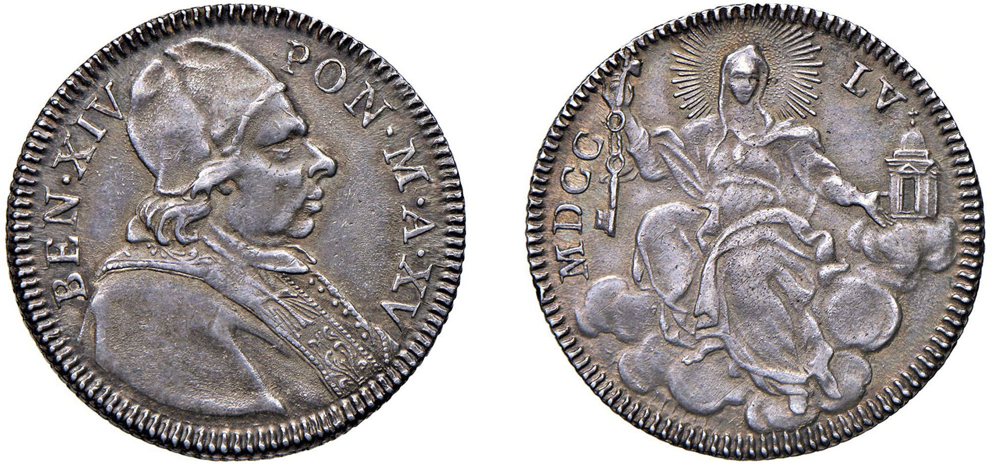 BENEDETTO XIV, Prospero Lambertini (1740-1758) - Quinto di scudo 1755, an. XV, RomaArgento - n.d.Dritto: Busto a destra con camauro. - Rovescio: La Chiesa seduta su nubi.Muntoni 51cSPLEx Montenegro 19 del 29 aprile 2022, lotto 537 - FDC67