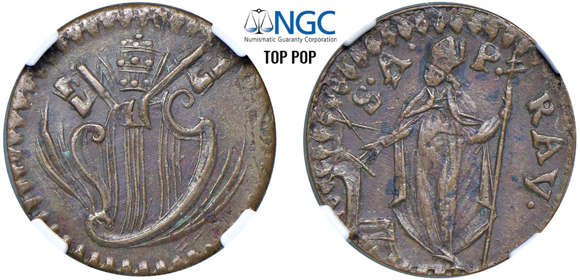 BENEDETTO XIV, Prospero Lambertini (1740-1758) - Quattrino s.d., RavennaRame - n.d.Dritto: Stemma sormontato da triregno e chiavi decussate in parte nascoste. - Rovescio: Figura di San Apollinare mitrato con piviale, con capo volto a sinistra verso chiesa con campanile.Muntoni 736Sigillato NGC AU55 BN - TOP POPCertificato NGC n. 2791842-008Ex Inasta 54 del 17 maggio 2014