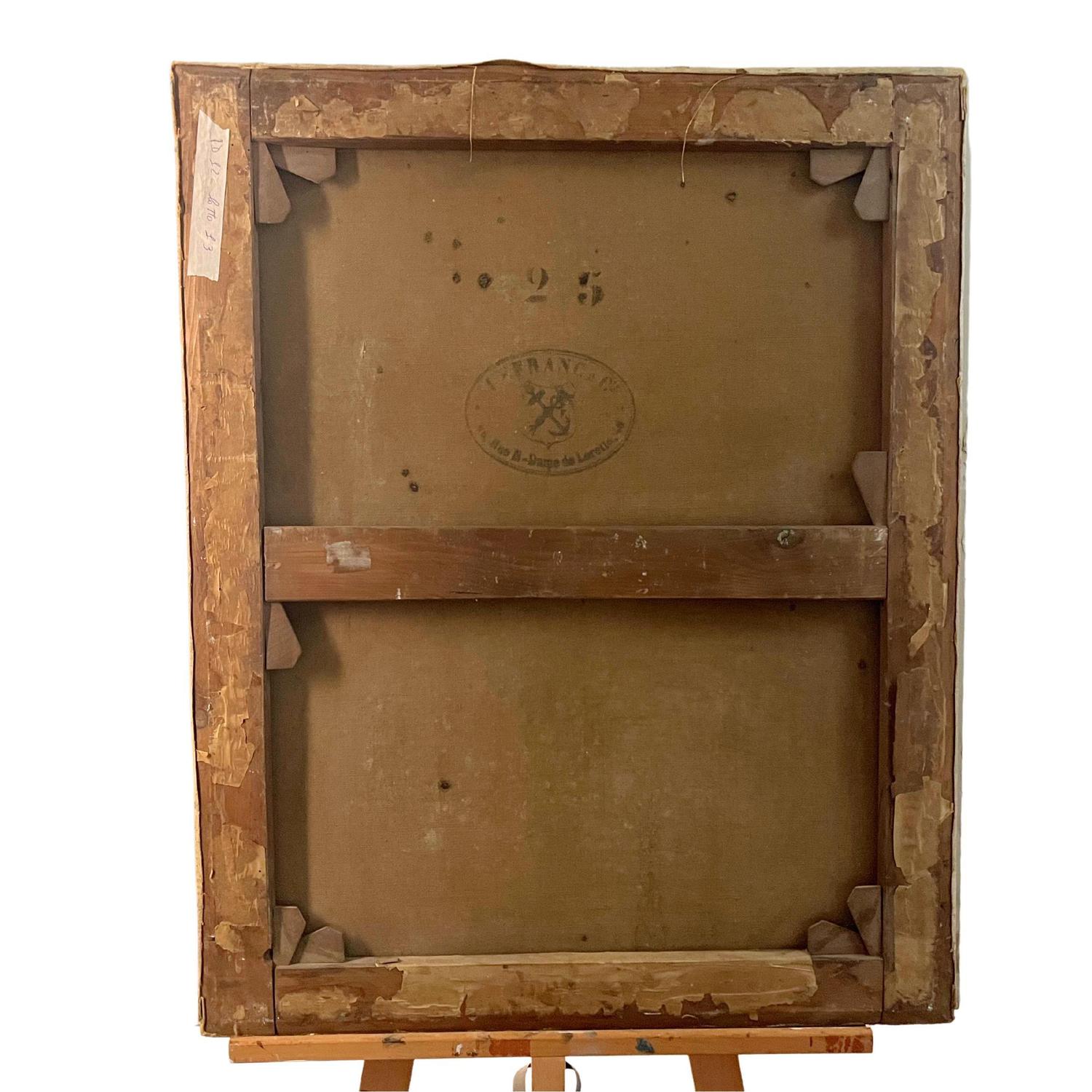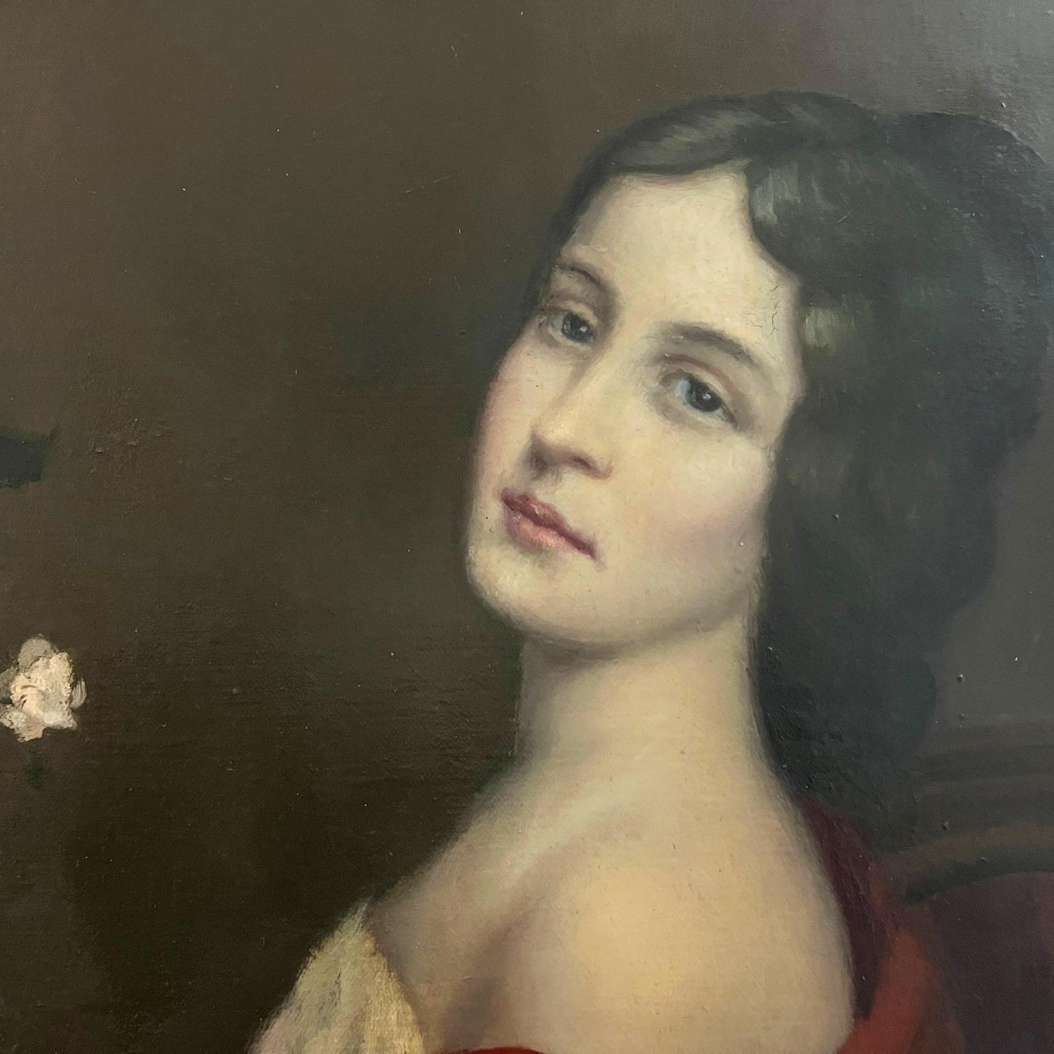 Dipinto olio su tela, Scuola Francese raffigurante Ritratto di donna seduta, sfondo pittorico ornato da vaso con fiori XIX secolo.