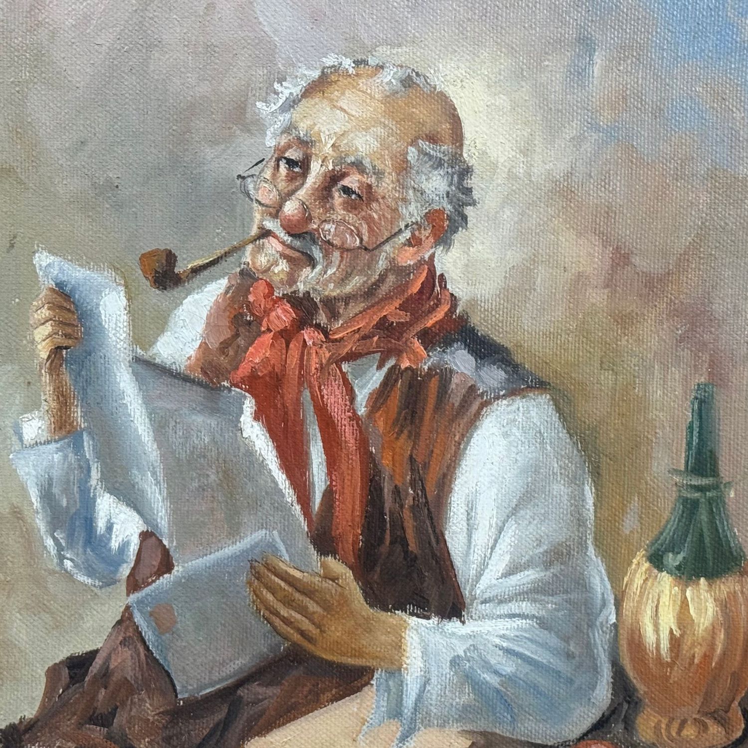 Dipinto olio su tela, periodo XX secolo scuola Italiana, raffigurante Anziano con pipa in lettura.