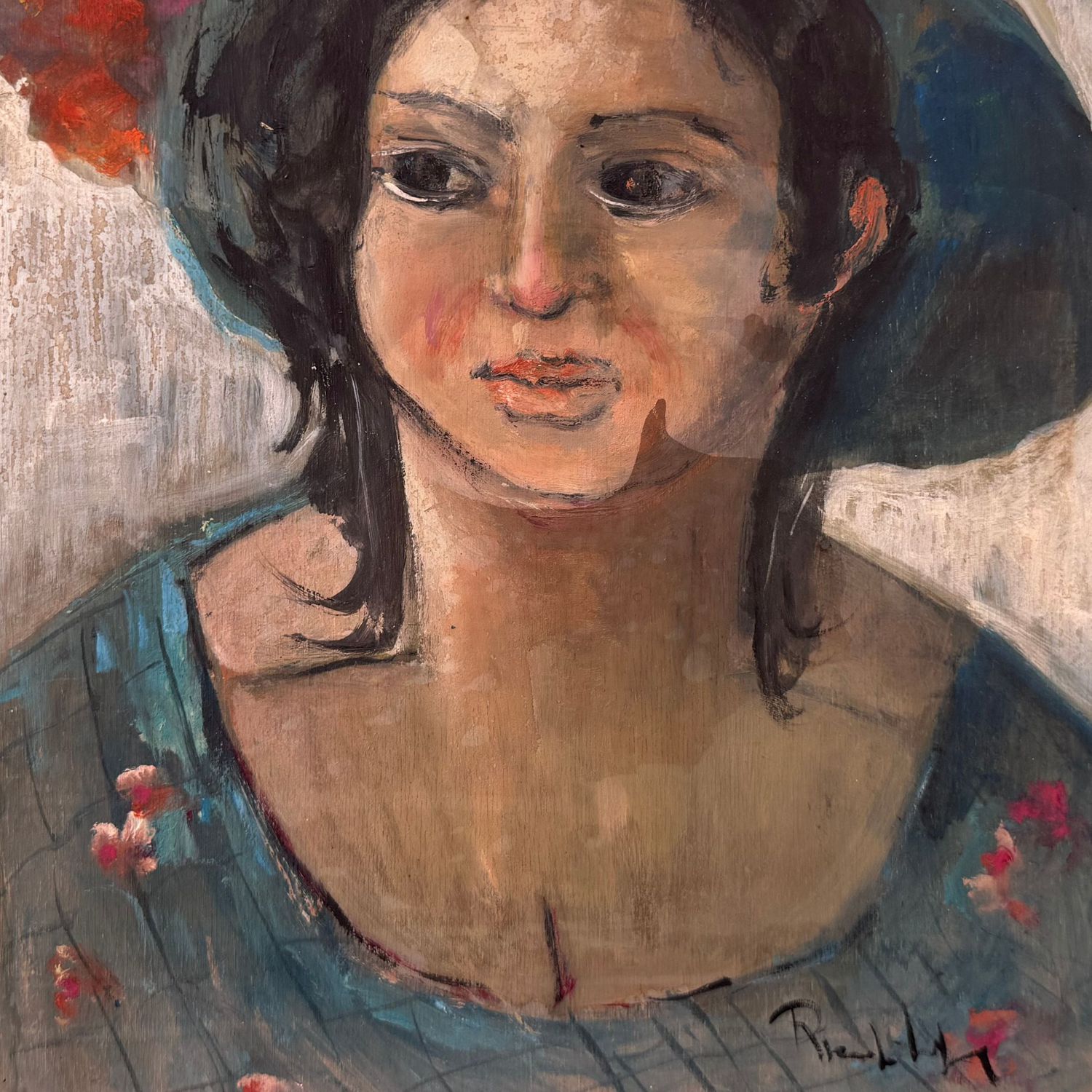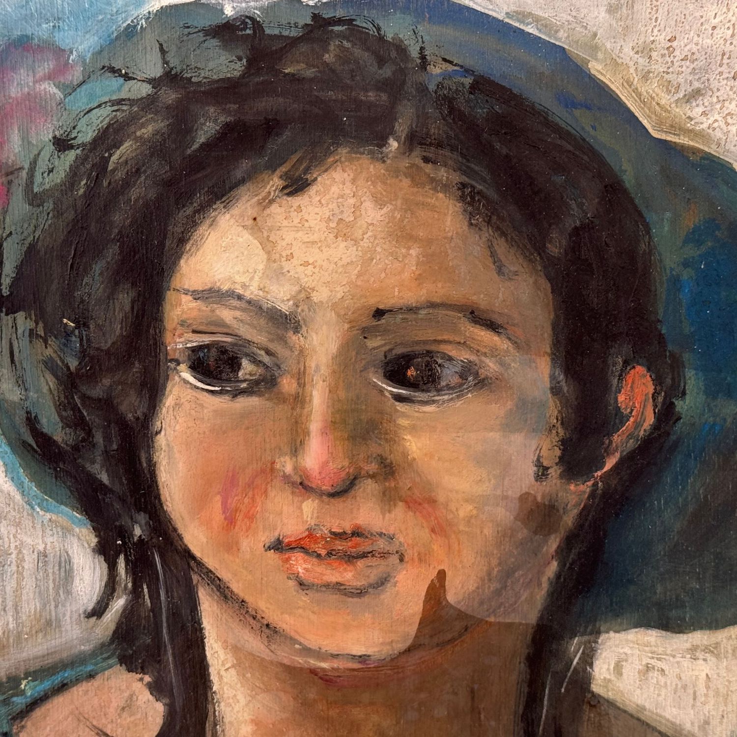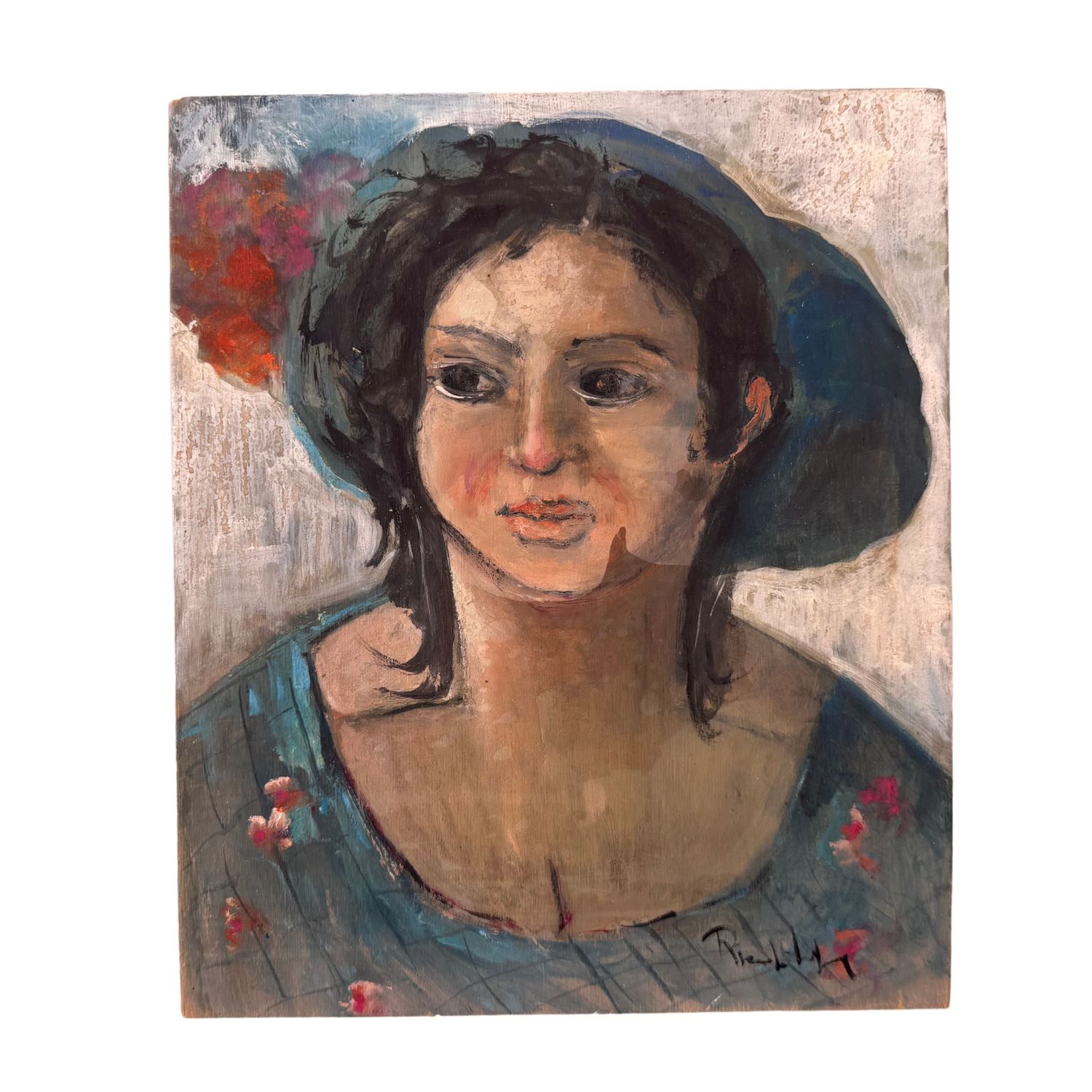 Dipinto olio su tavola, periodo XX secolo scuola Italiana, raffigurante Donna con cappello.
