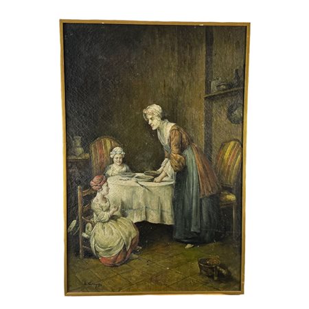 Dipinto olio su tela, periodo XX secolo scuola Italiana, copia da Jean Baptiste Simeon Chardin (1699 - 1779), raffigurante Personaggi in un interno. Dimensioni interno cornice: 60x90 cm. Dimensioni compreso cornice: 62x92 cm. Reca firma in basso a sinistra di difficile lettura. Opera in discrete condizioni con lievi segni di vissuto come da foto allegate.