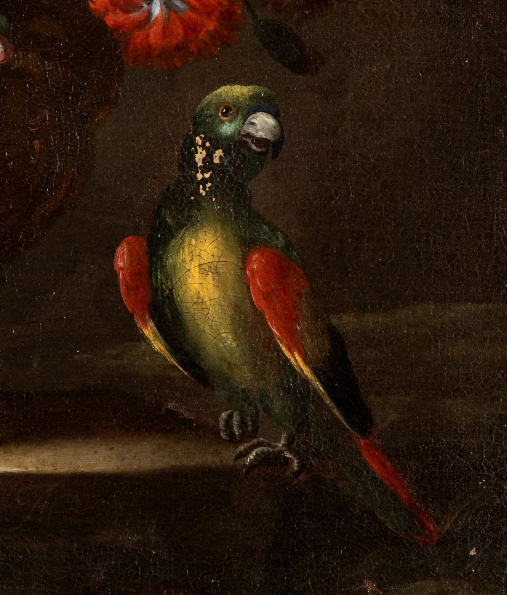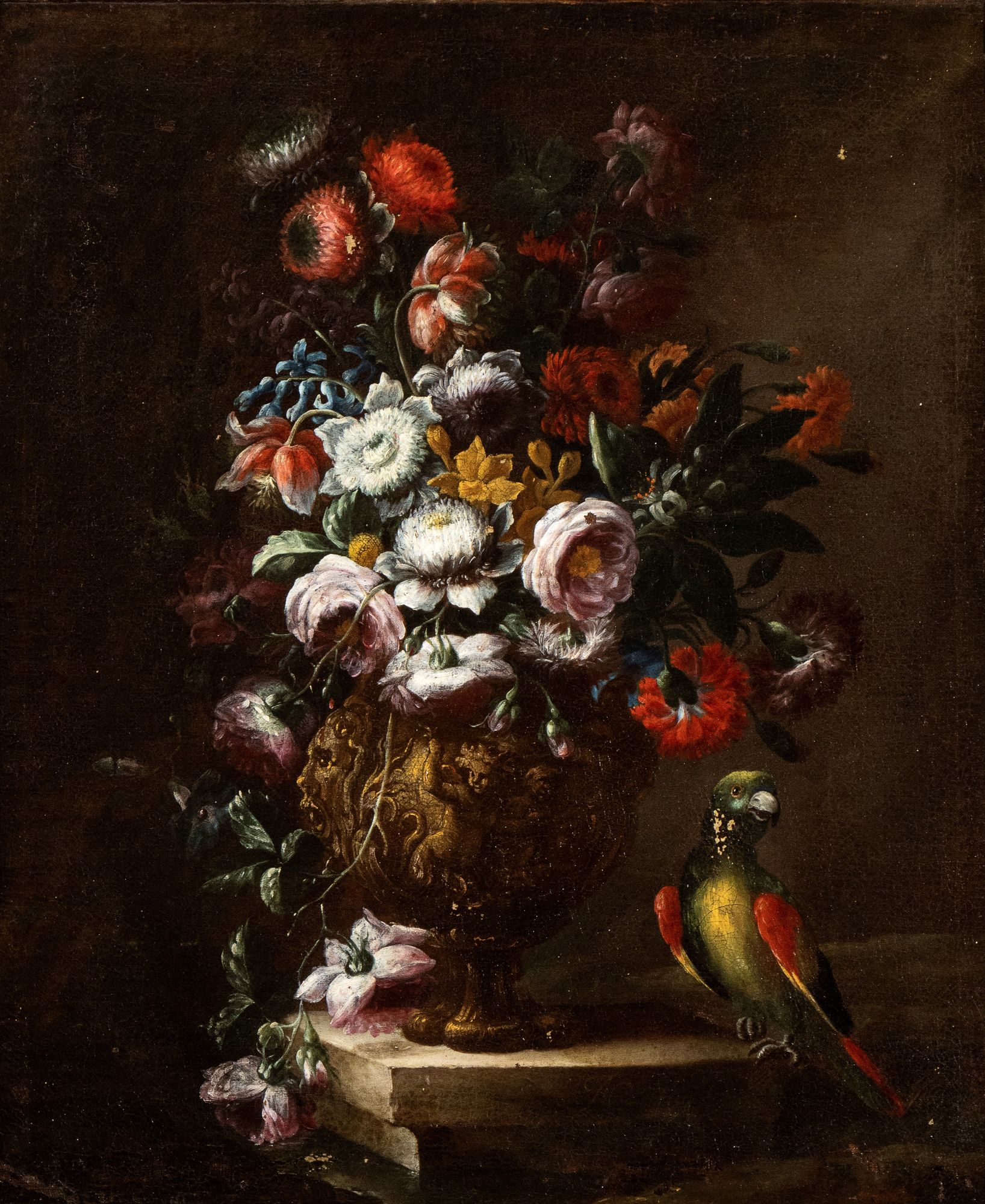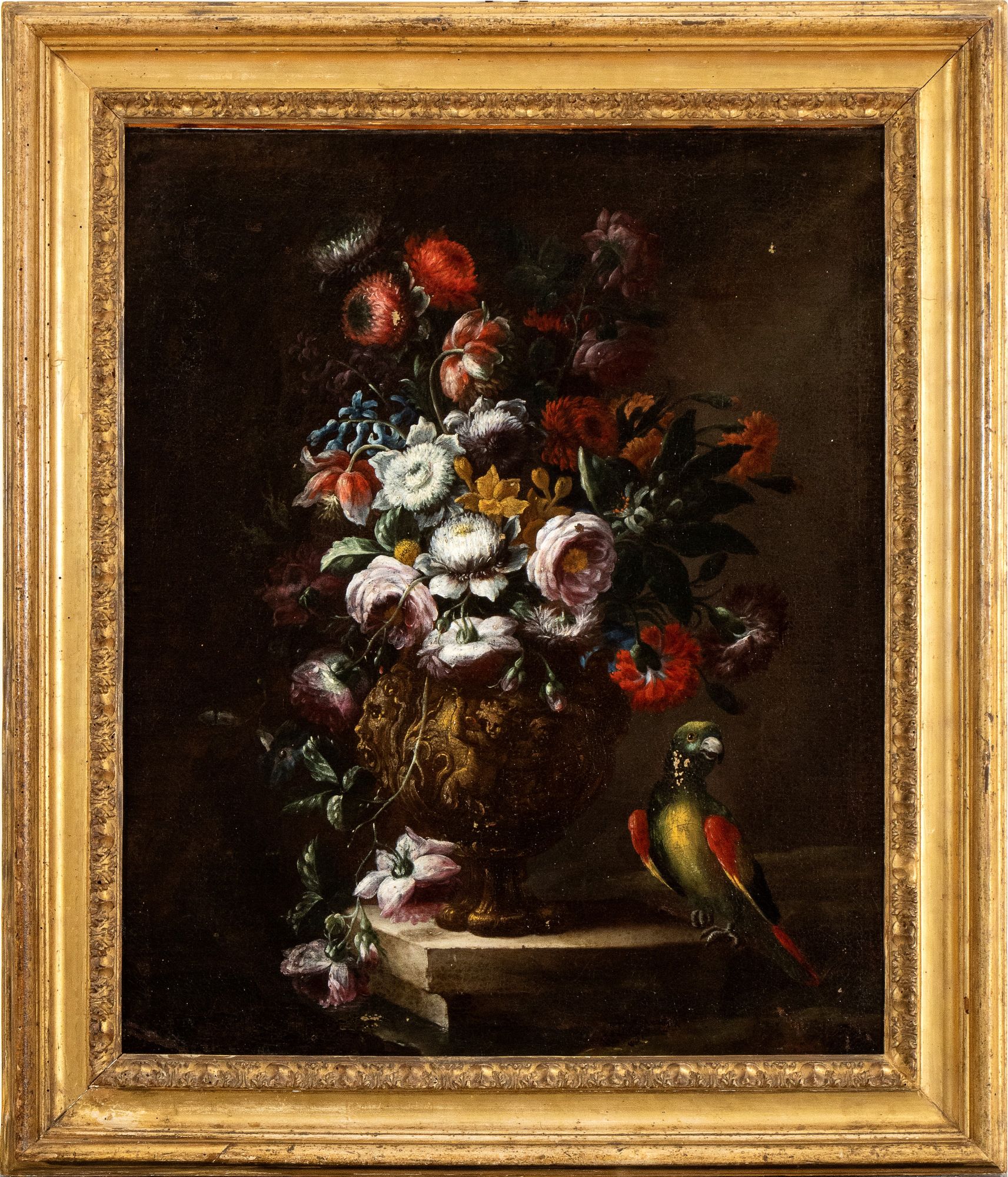Still life of flowers and metal vase decorated with parrot Oil on canvas cm. 75x62,5. Framed The painting bears the signature on the marble base of the vase: "N. CASISSA F[...]".