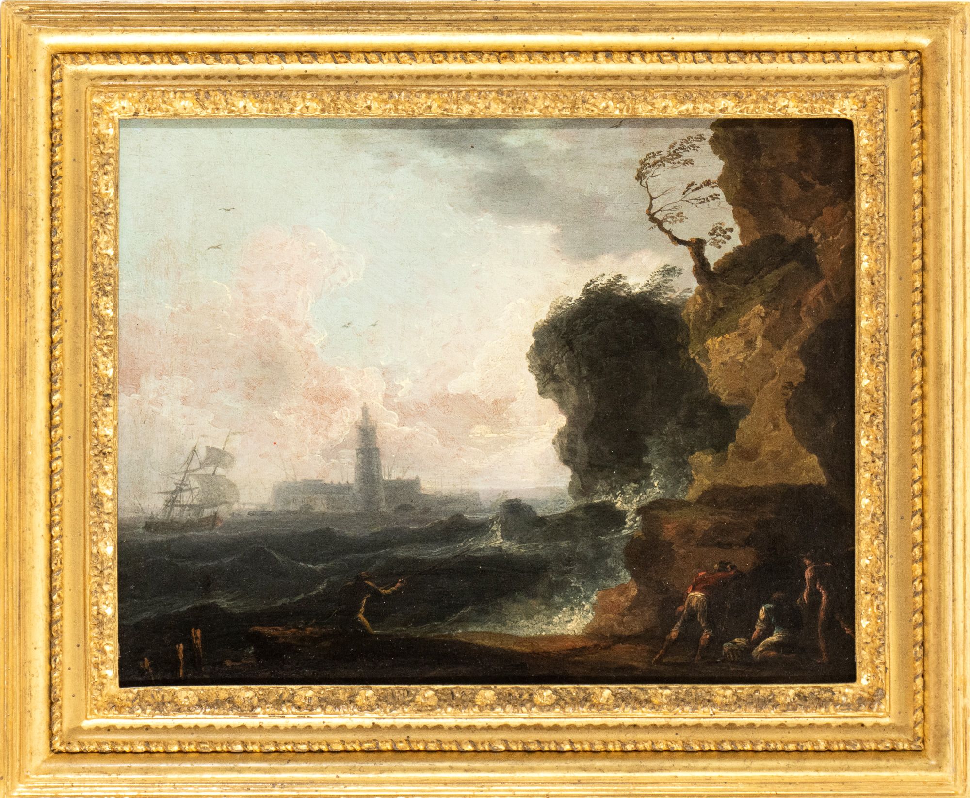 a) Marina with reef, shipwrecks and citadel in the background; b) Marina with fishermen, galley and lighthouse. Pair of paintings a) Oil on canvas; b) oil on canvas laid on panel a) 30x41,5 cm. Framed; b) 30x39 cm. Framed Private collection, Rome