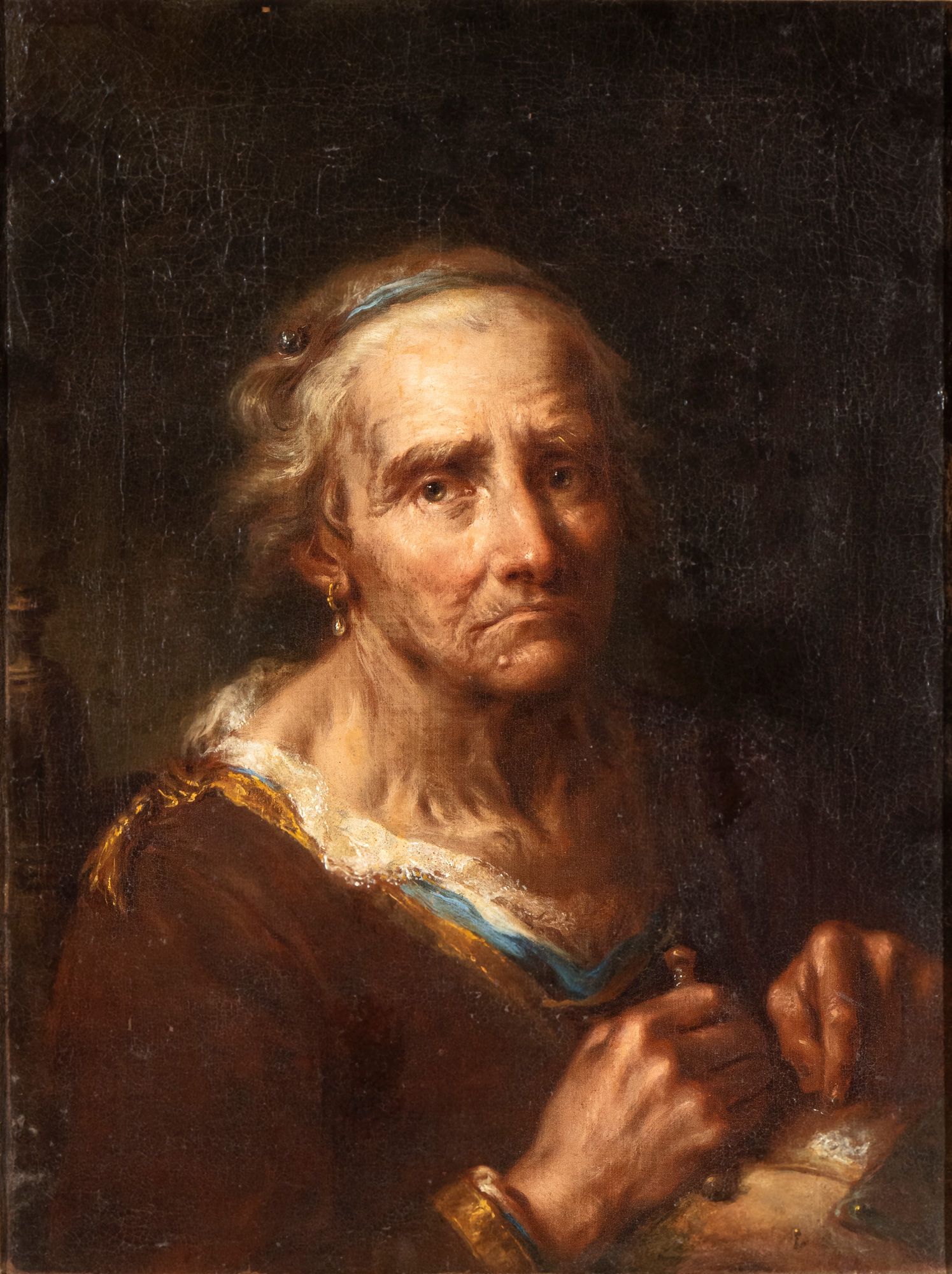 Portrait of an old woman sewing Oil on canvas cm. 61x45,5. With ancient venetian frame