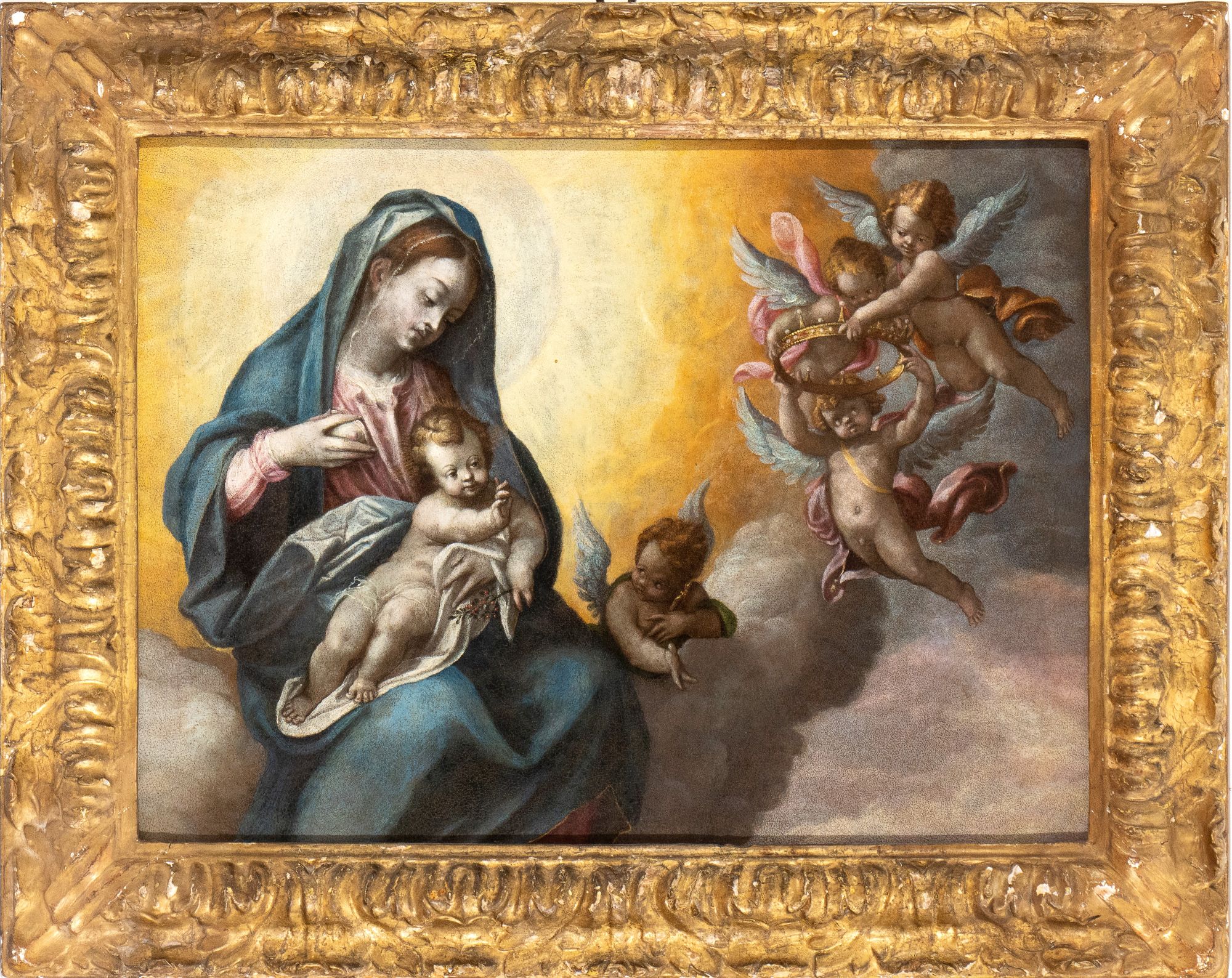 Madonna Lactans in glory Oil on lead cm. 49x65. Framed