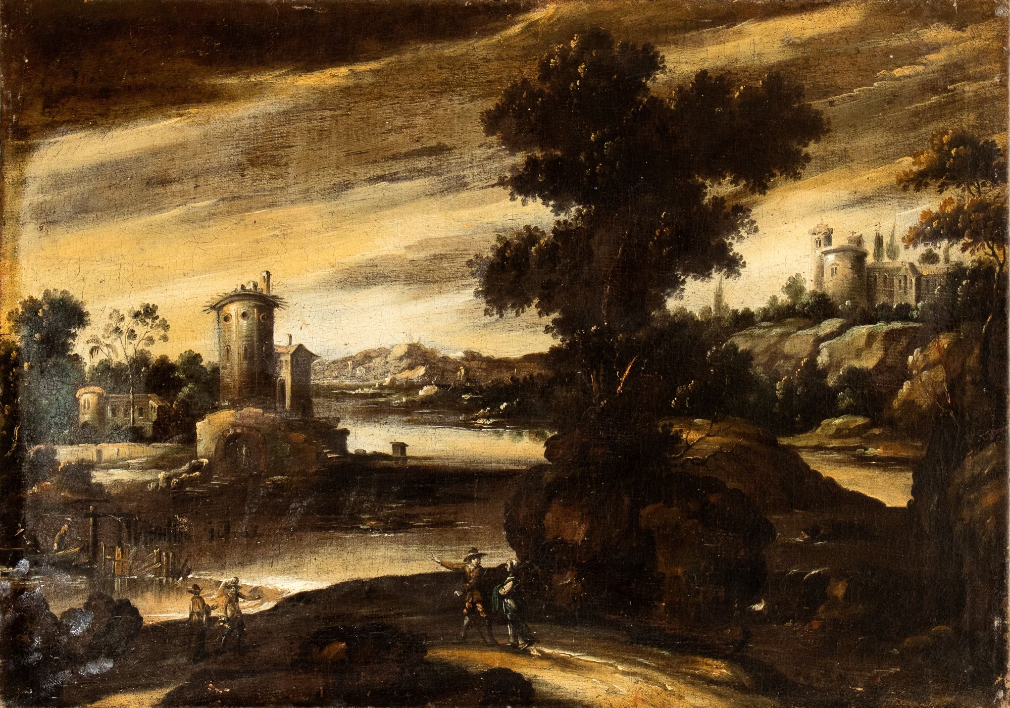 Landscape with watercourse, figures and a citadel in the background Oil on canvas cm. 66x93,5