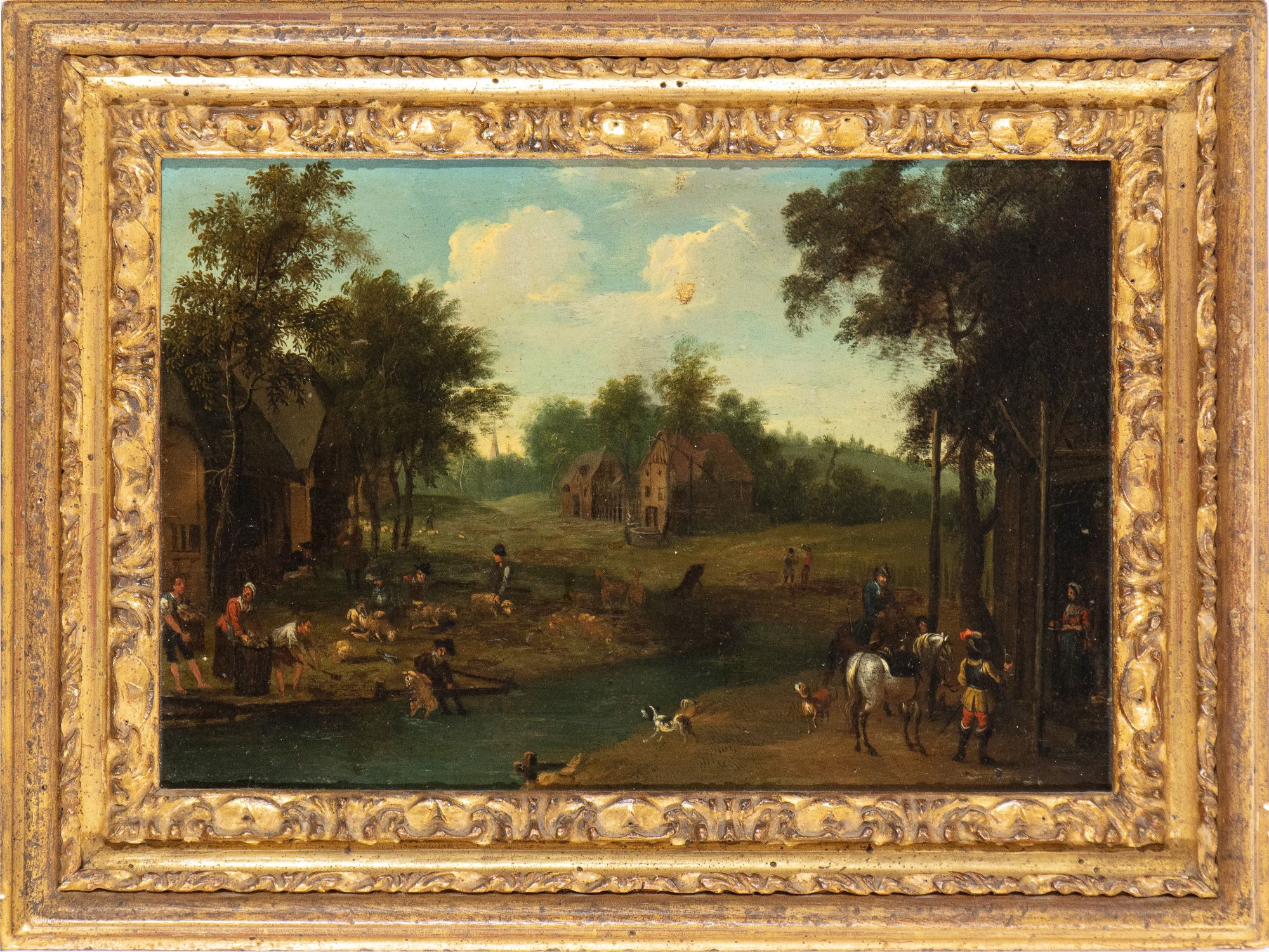 Landscape with stream, village and figures Oil on panel cm. 17,5x26. Framed Private collection, Lazio.
