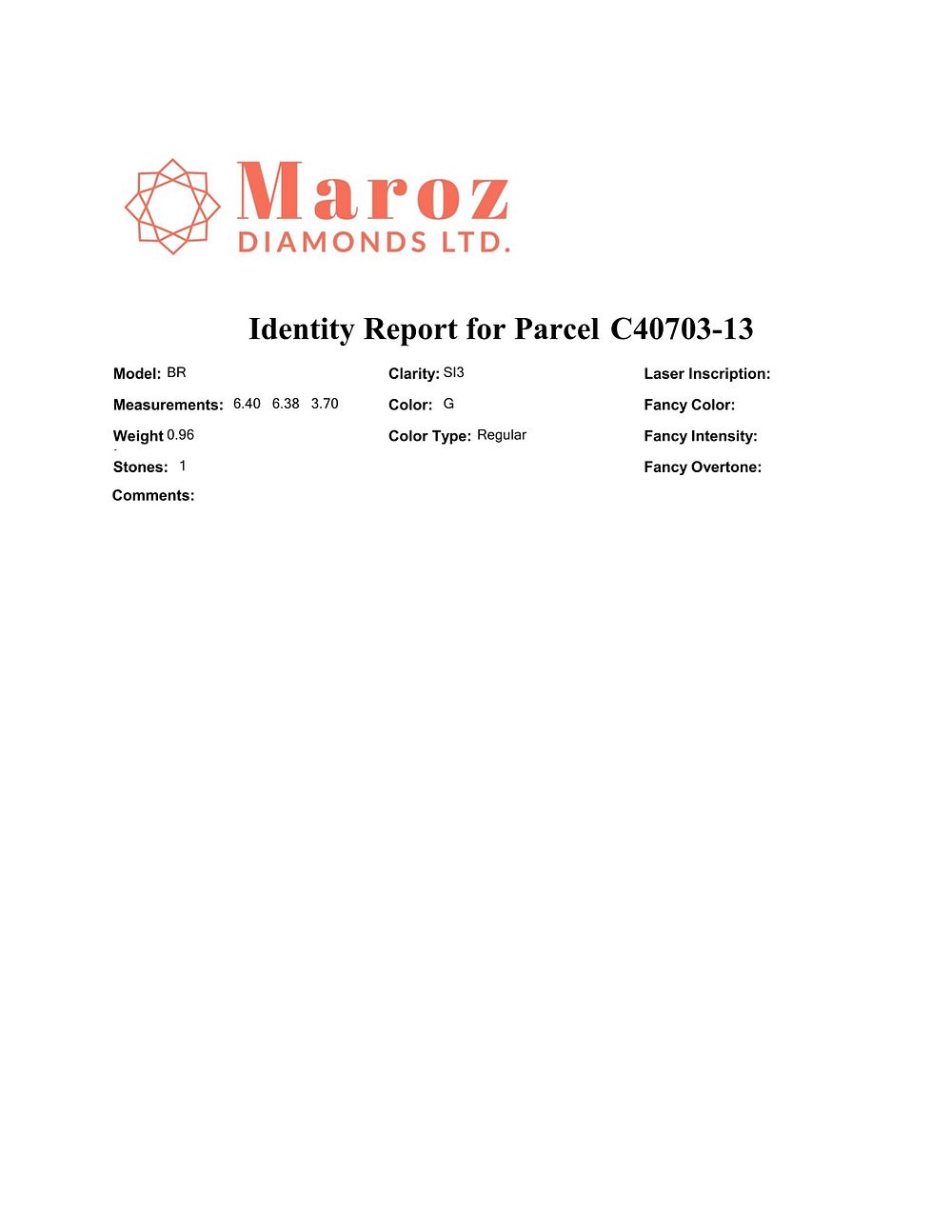 DIAMANTE NATURAL POLISHED 0,96 CARATI COLORE G - PUREZZA SI3 - TAGLIO BRILLANTE - CERTIFICATO GEMMOLOGICO MAROZ DIAMONDS LTD MEMBRO ISRAEL DIAMOND EXCHANGE - C40703-13