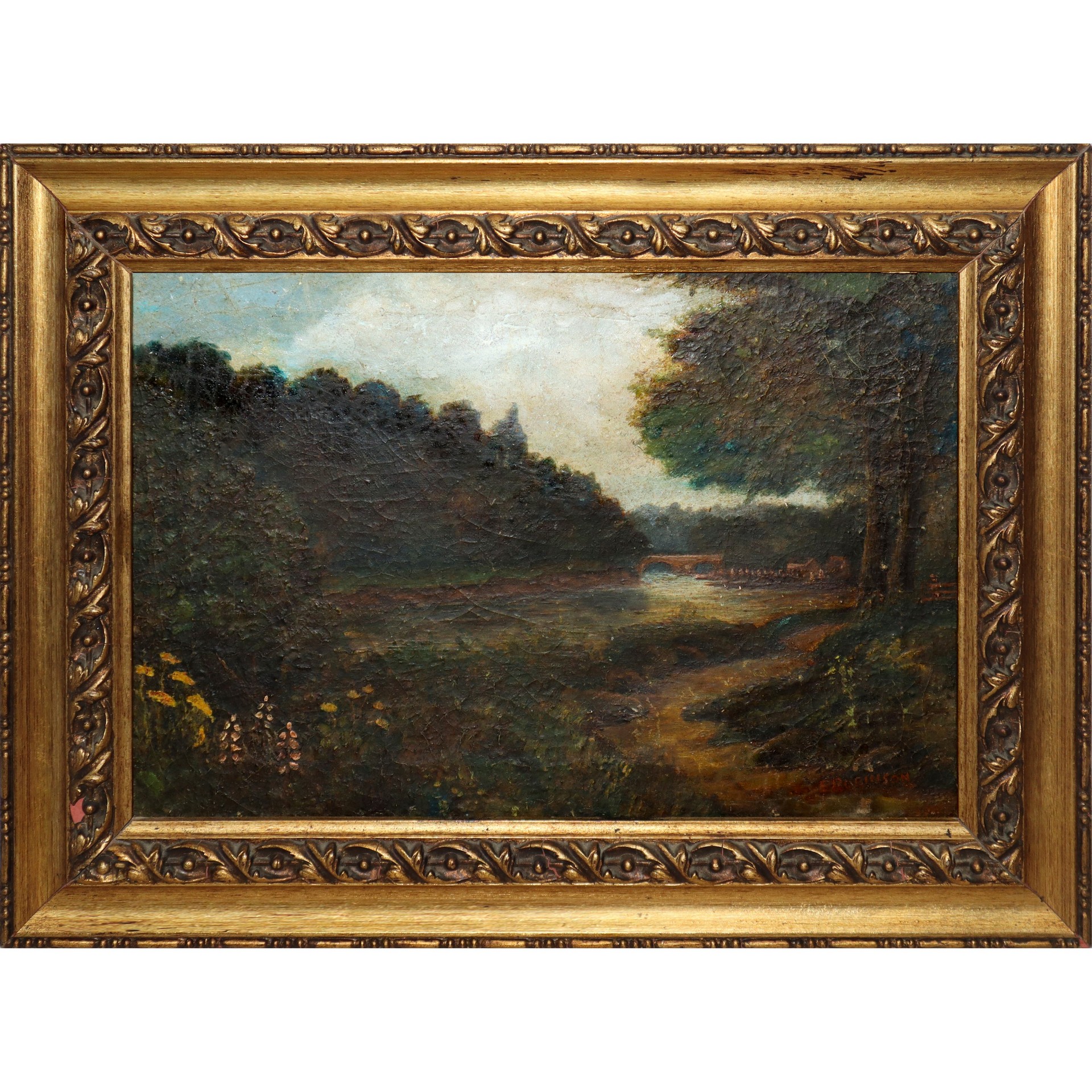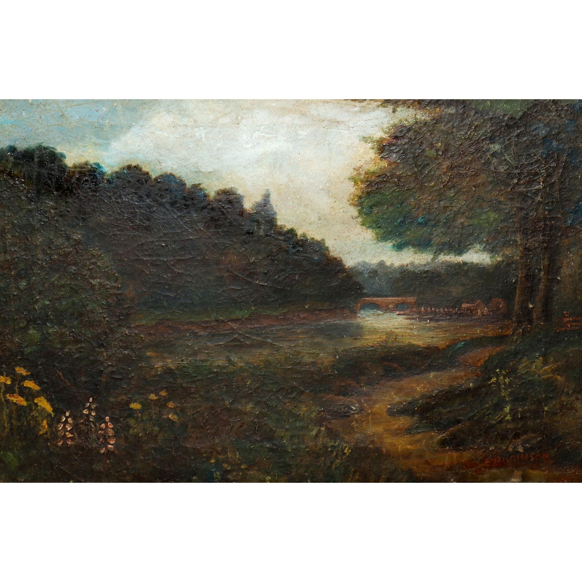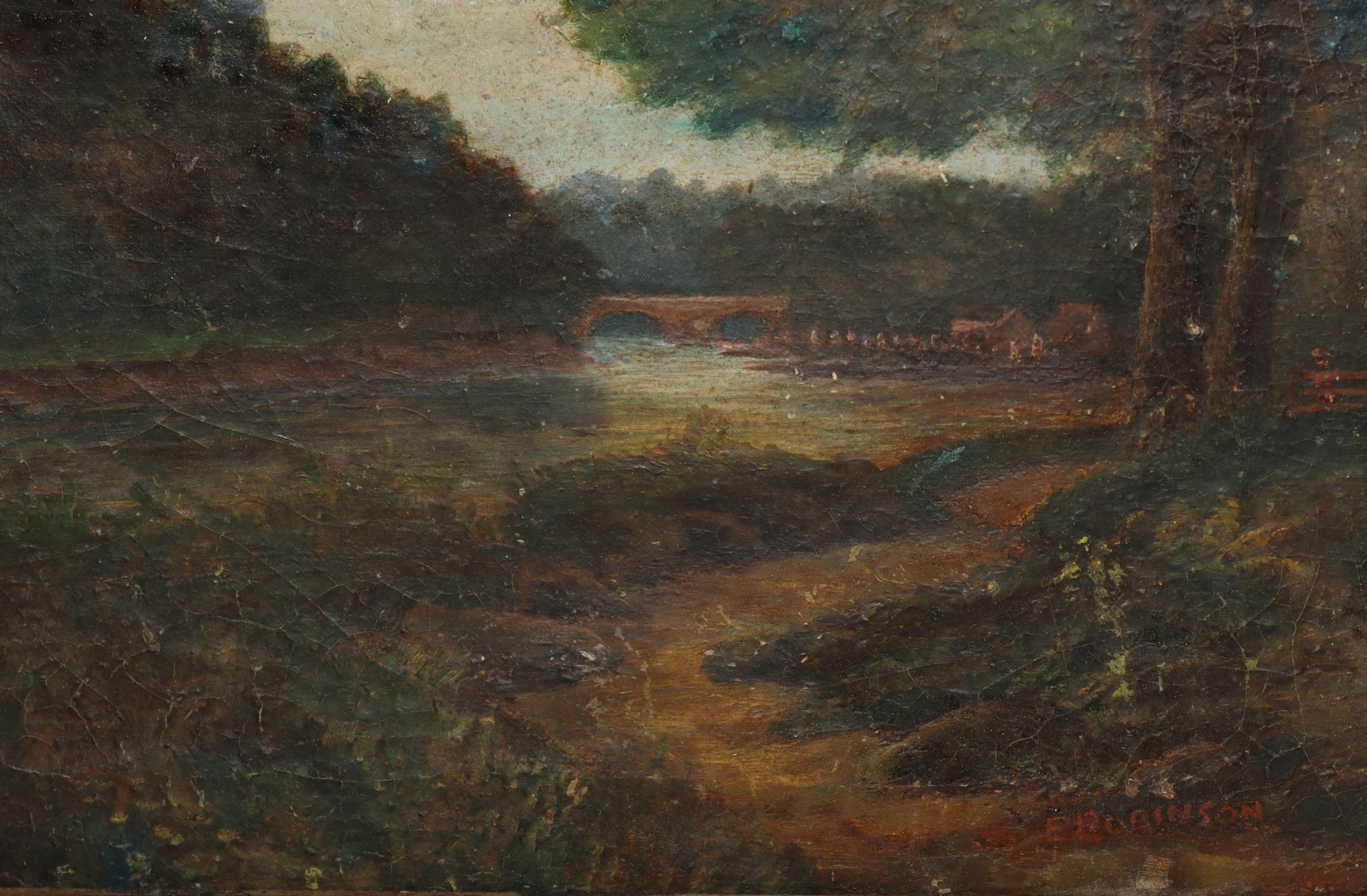 Edward Robinson (1824-1883) - Paesaggio fluviale con ponte h cm 26X36 in cornice h cm 36X46 Olio su tela Iscrizione sulla tela. Firmato in basso a destra