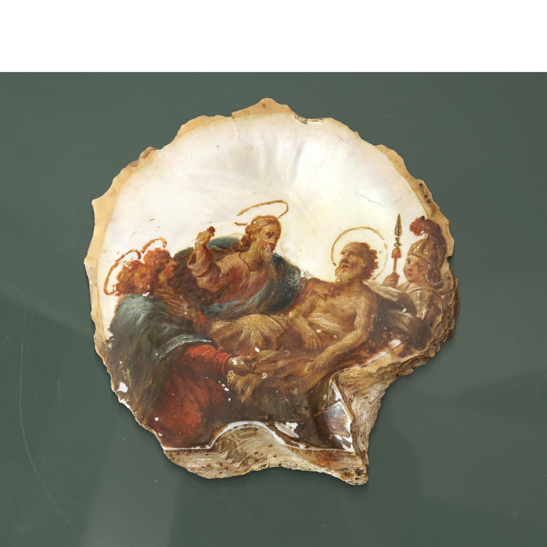 Conchiglia dipinta in policromia con scena biblica, Transito di S.Giuseppe, 18° secolo