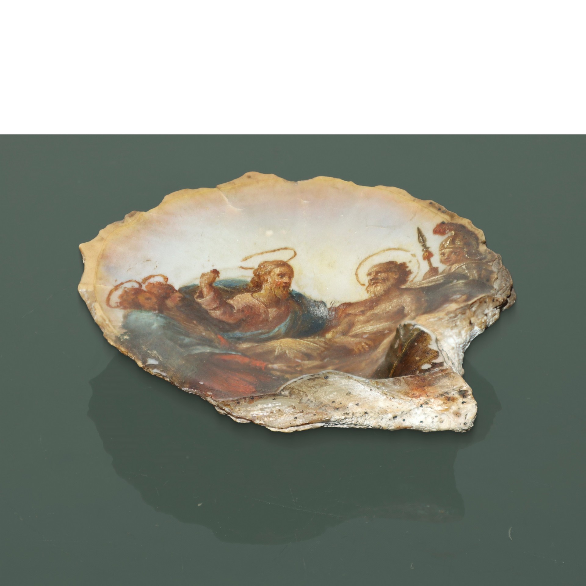 Conchiglia dipinta in policromia con scena biblica, Transito di S.Giuseppe, 18° secolo h cm 14 diametro cm 13