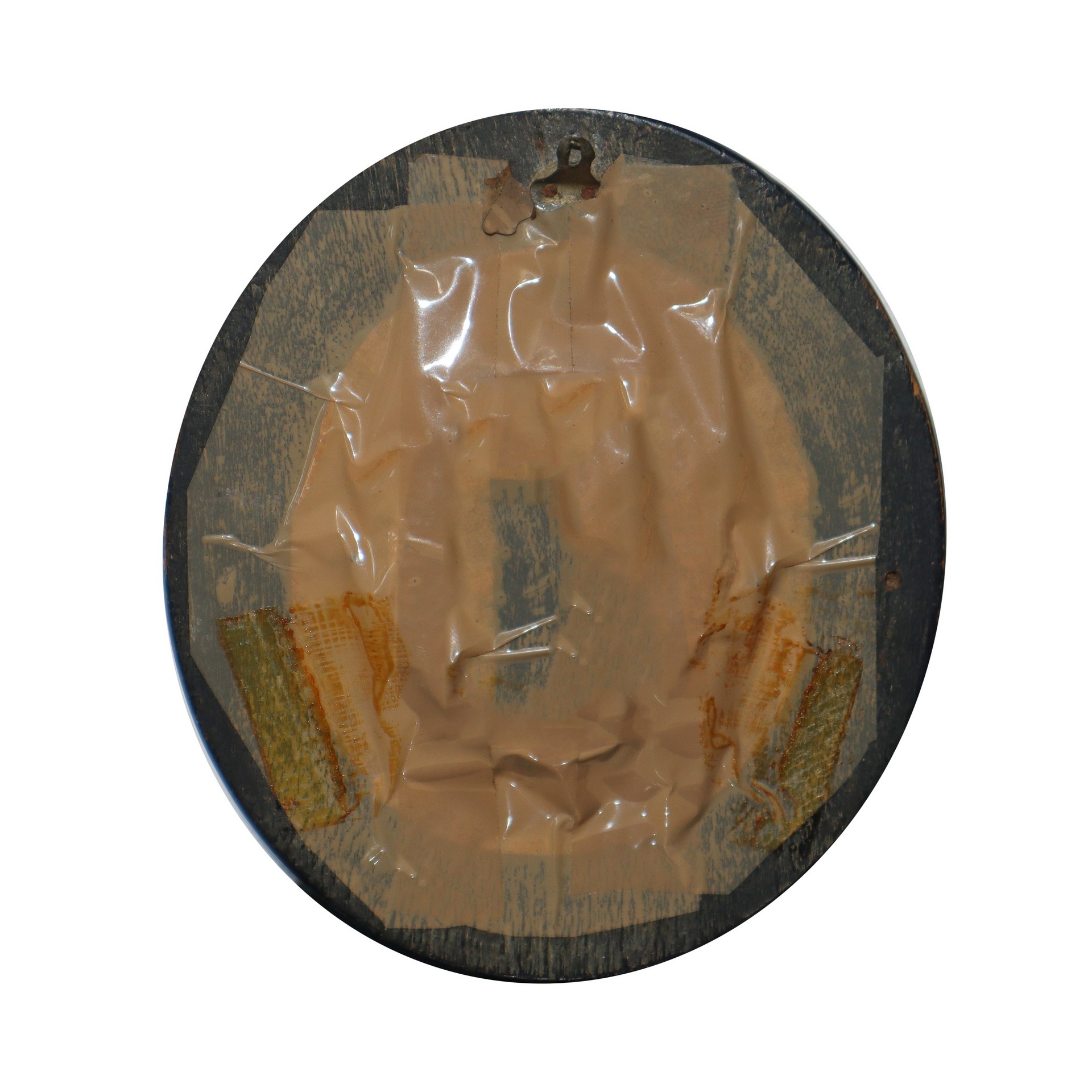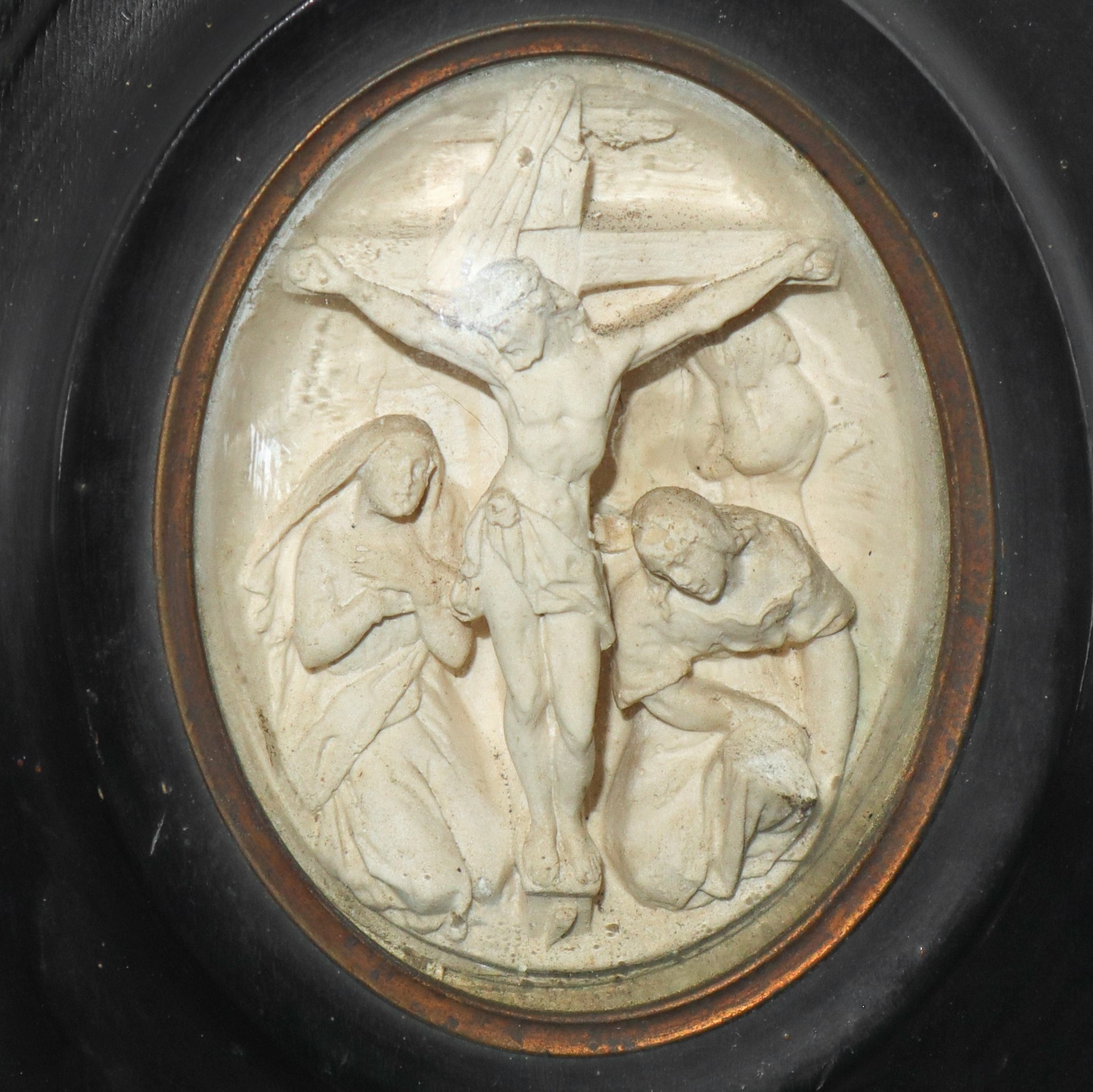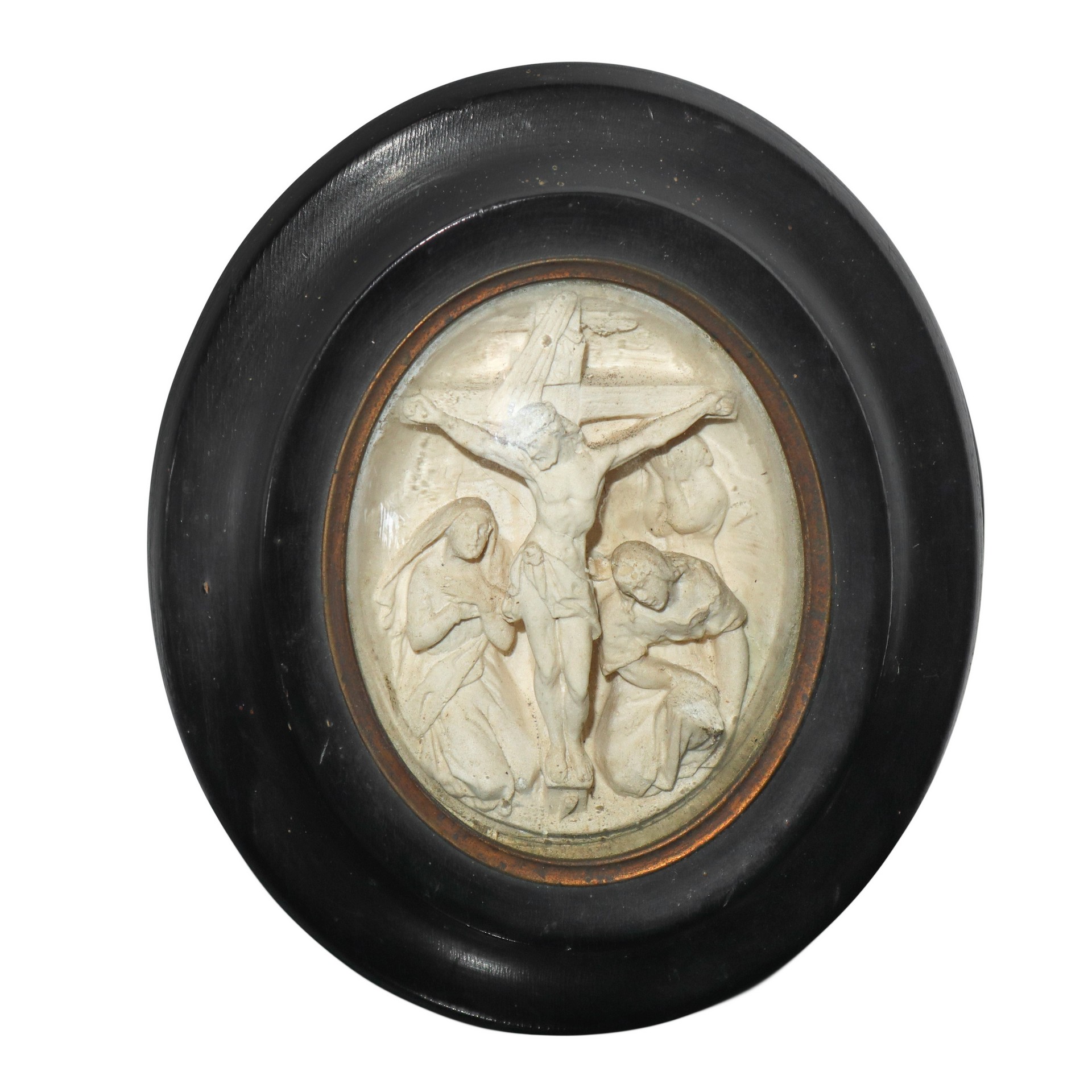 Bassorilievo in schiuma di mare raffigurante Crocifissione, 19° secolo h cm 15X13 Cornice ovale in legno nero ebanizzato Cornice ovale in legno nero ebanizzato