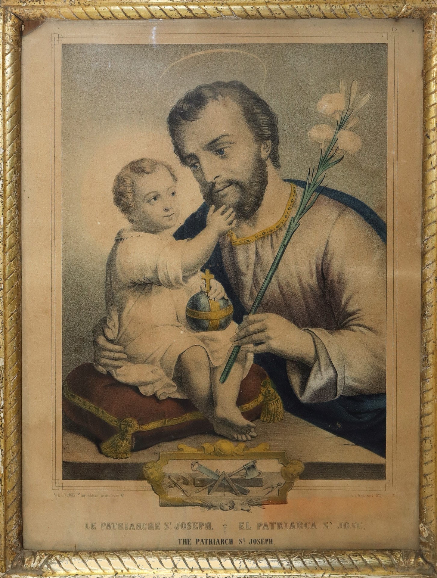 Cornice in legno dorato a foglia, argento e mistura, Sicilia, 19° secolo interno cm 35 x cm 27, esterno cm 46 x cm 37 Con stampa di San Giuseppe con bambino, applicazioni in pastigliaCon stampa di San Giuseppe con bambino, applicazioni in pastiglia