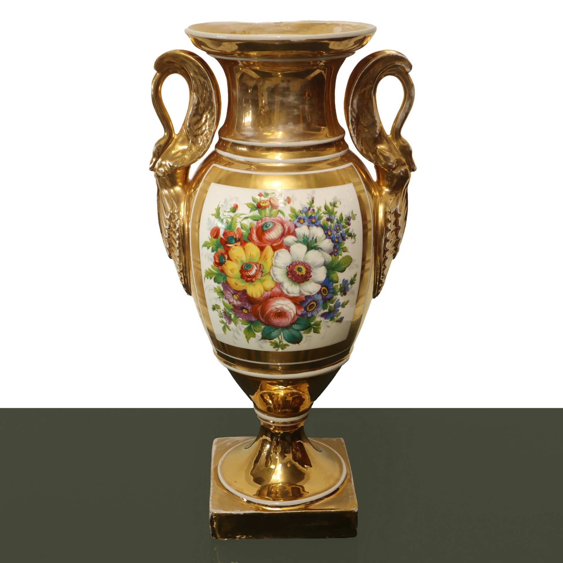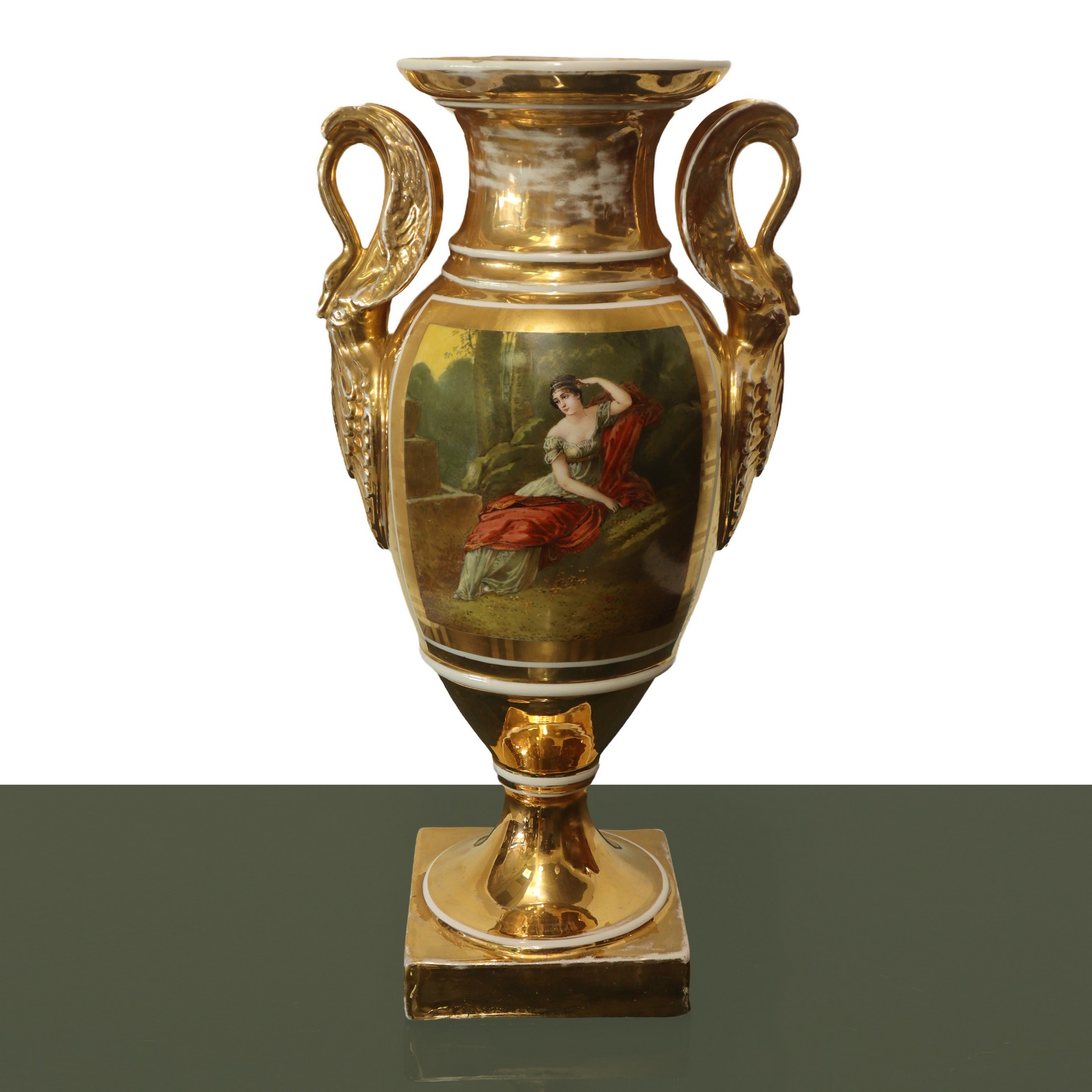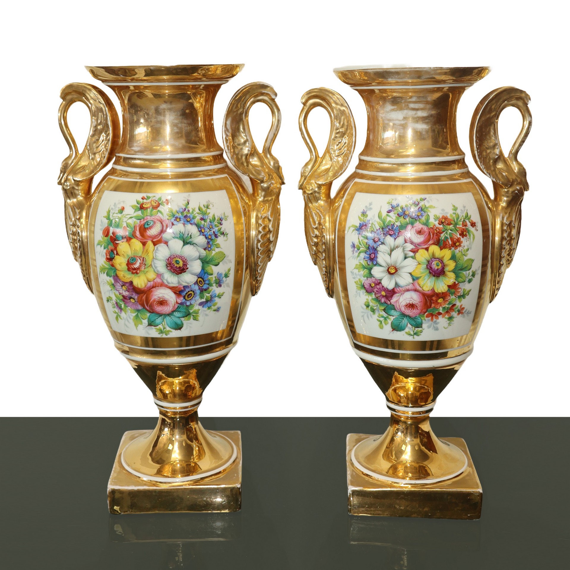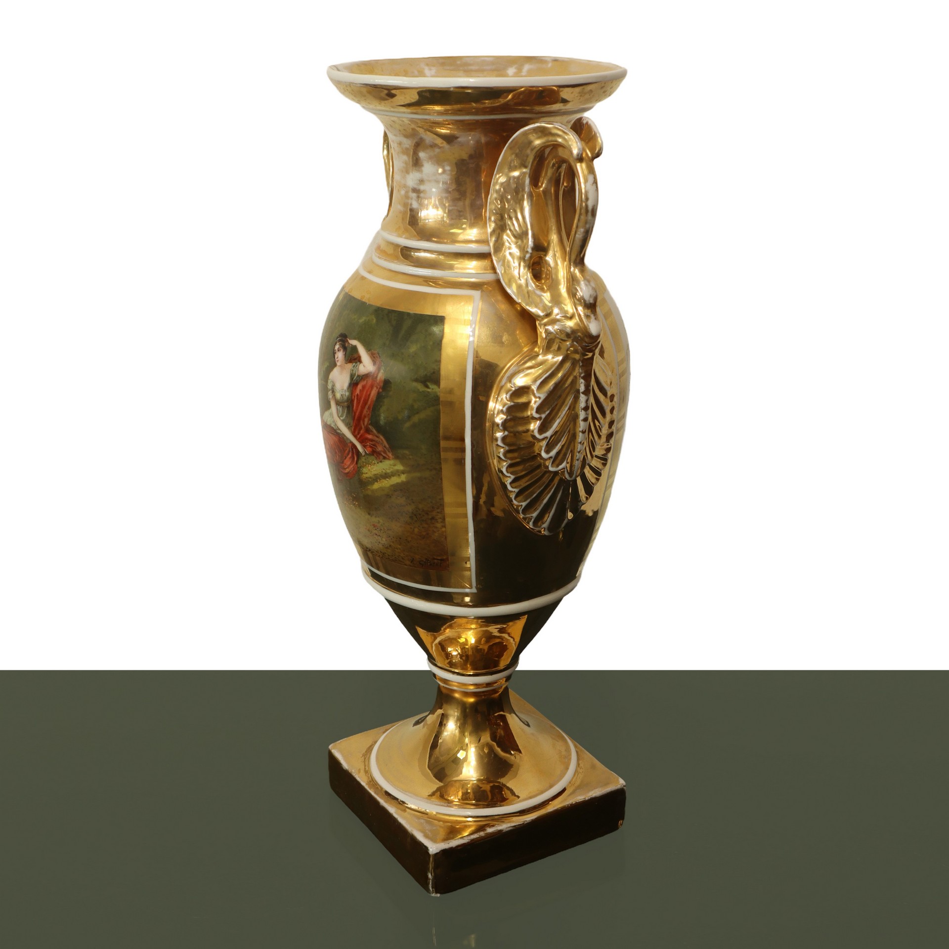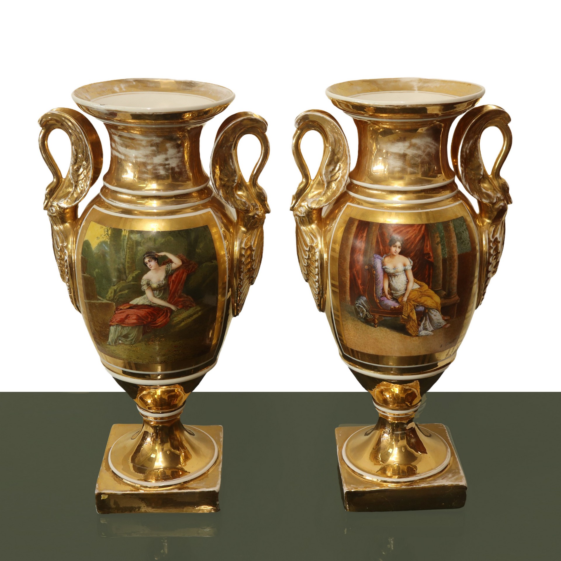 Coppia di vasi Impero in porcellana dipinta e dorata ad ormolou., France, 19° secolo. h cm 45,5X25 Sul fronte scene di genere, sul retro fiori, prese a guisa di cigno. Firmati A.GilbertSul fronte scene di genere, sul retro fiori, prese a guisa di cigno. Firmati A.Gilbert
