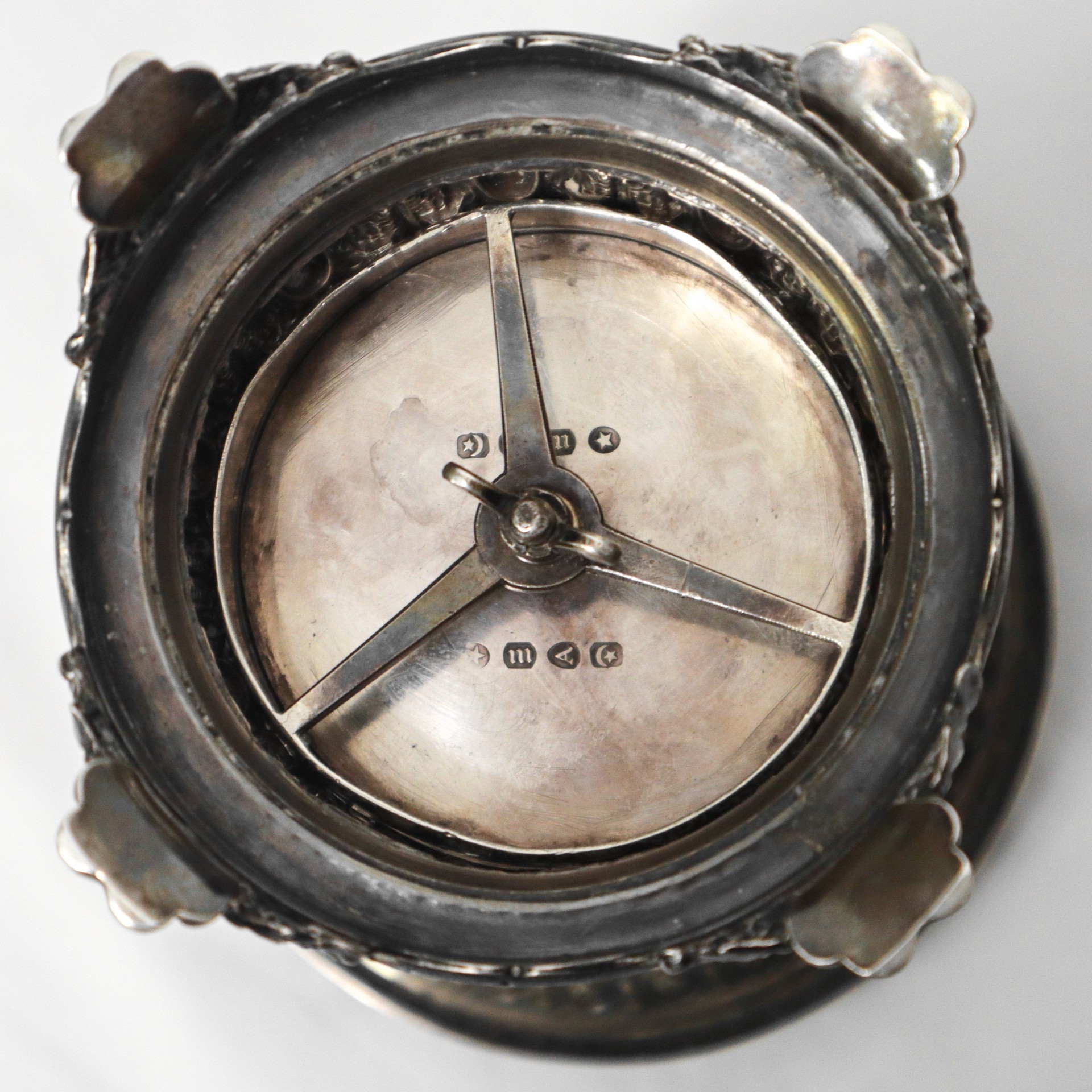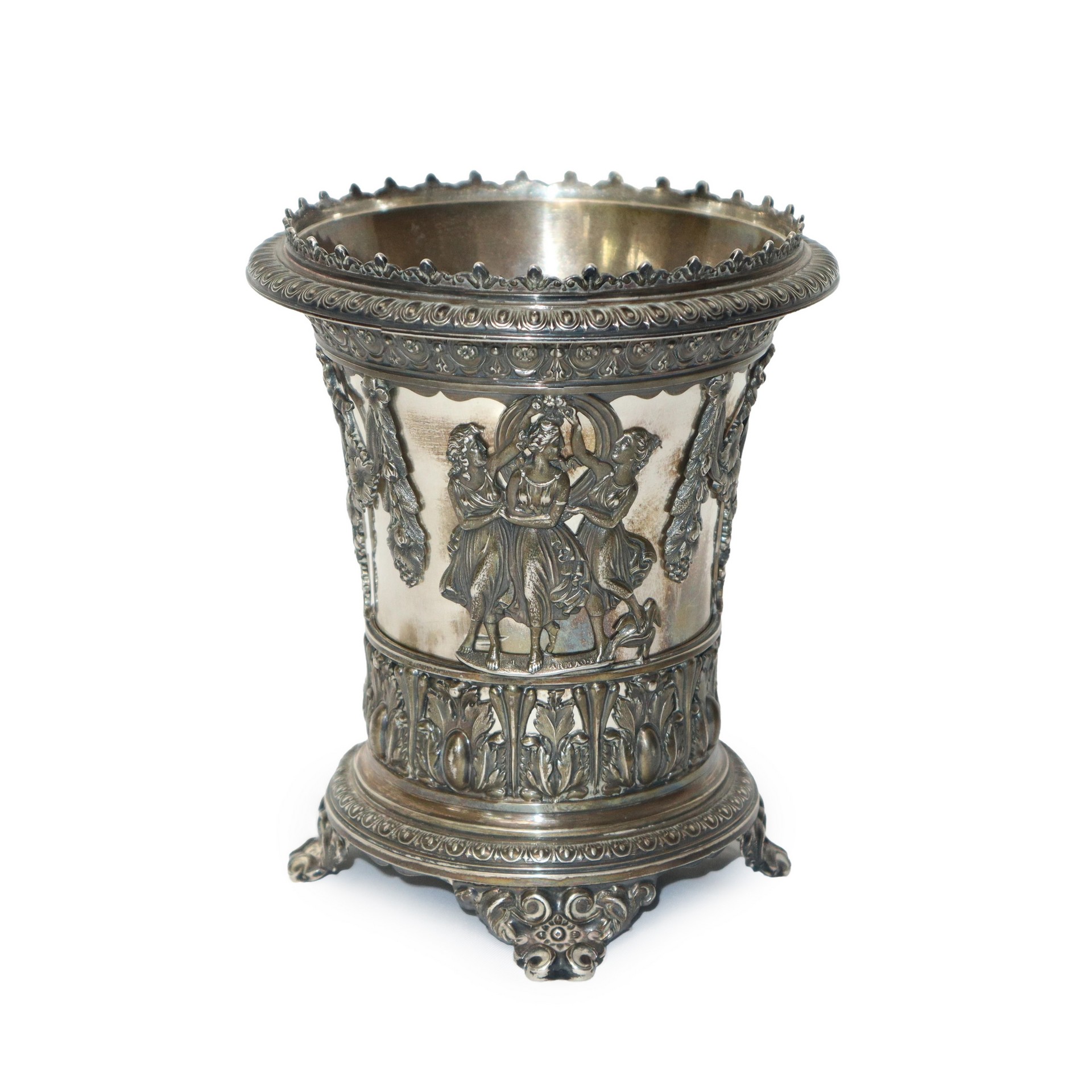 Vaso in argento in stile neoclassico con decori floreali e rappresentazione delle tre Grazie a rilievo