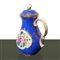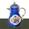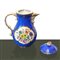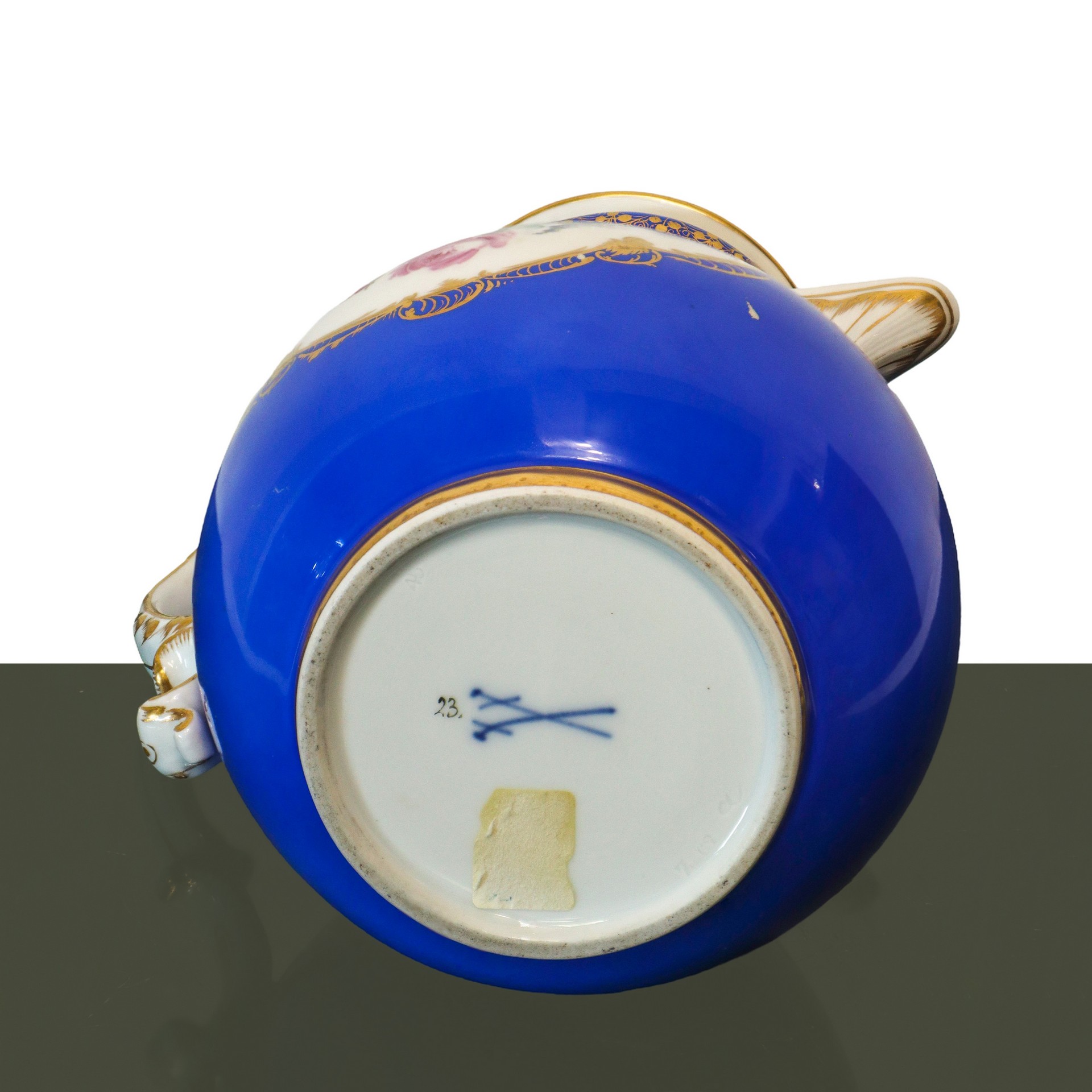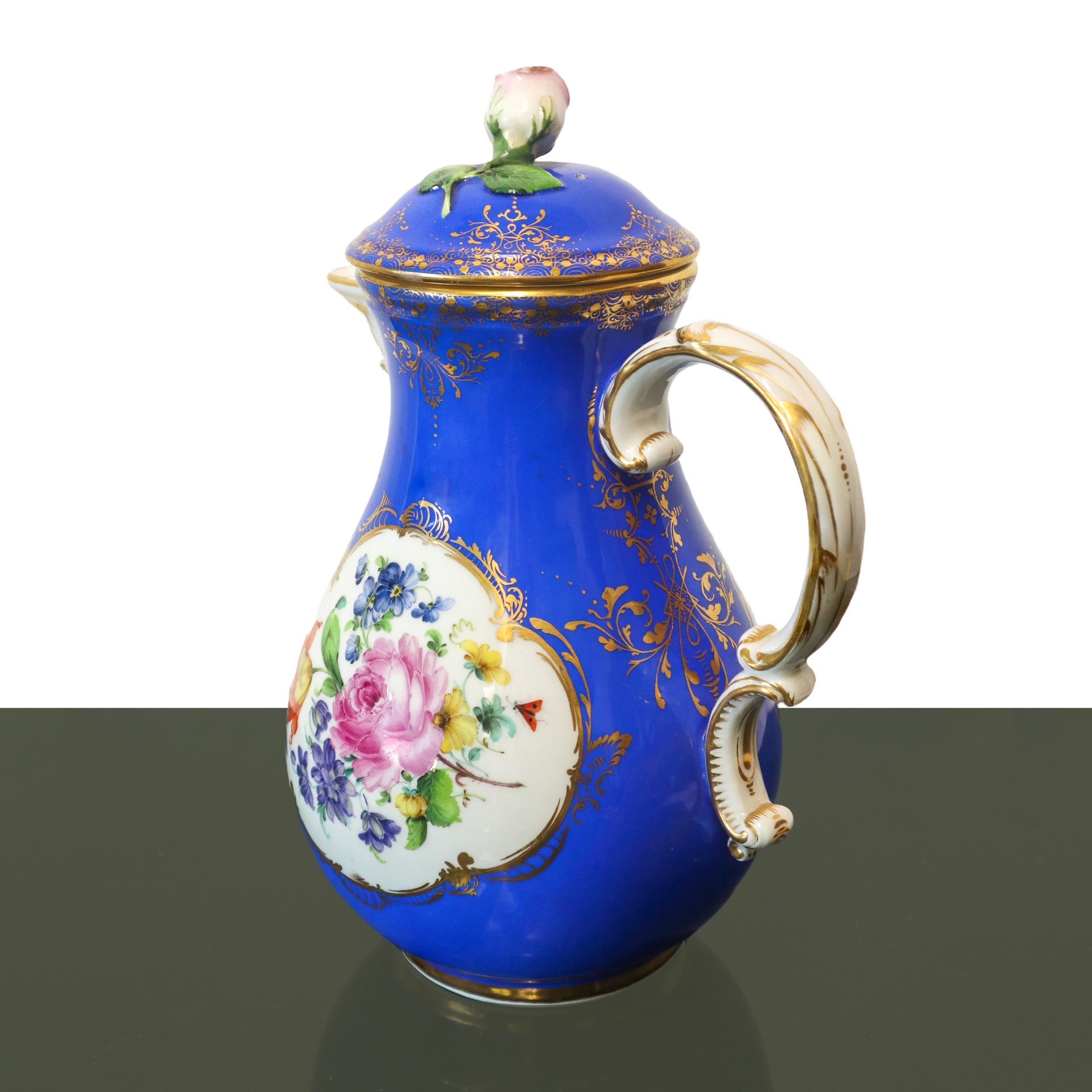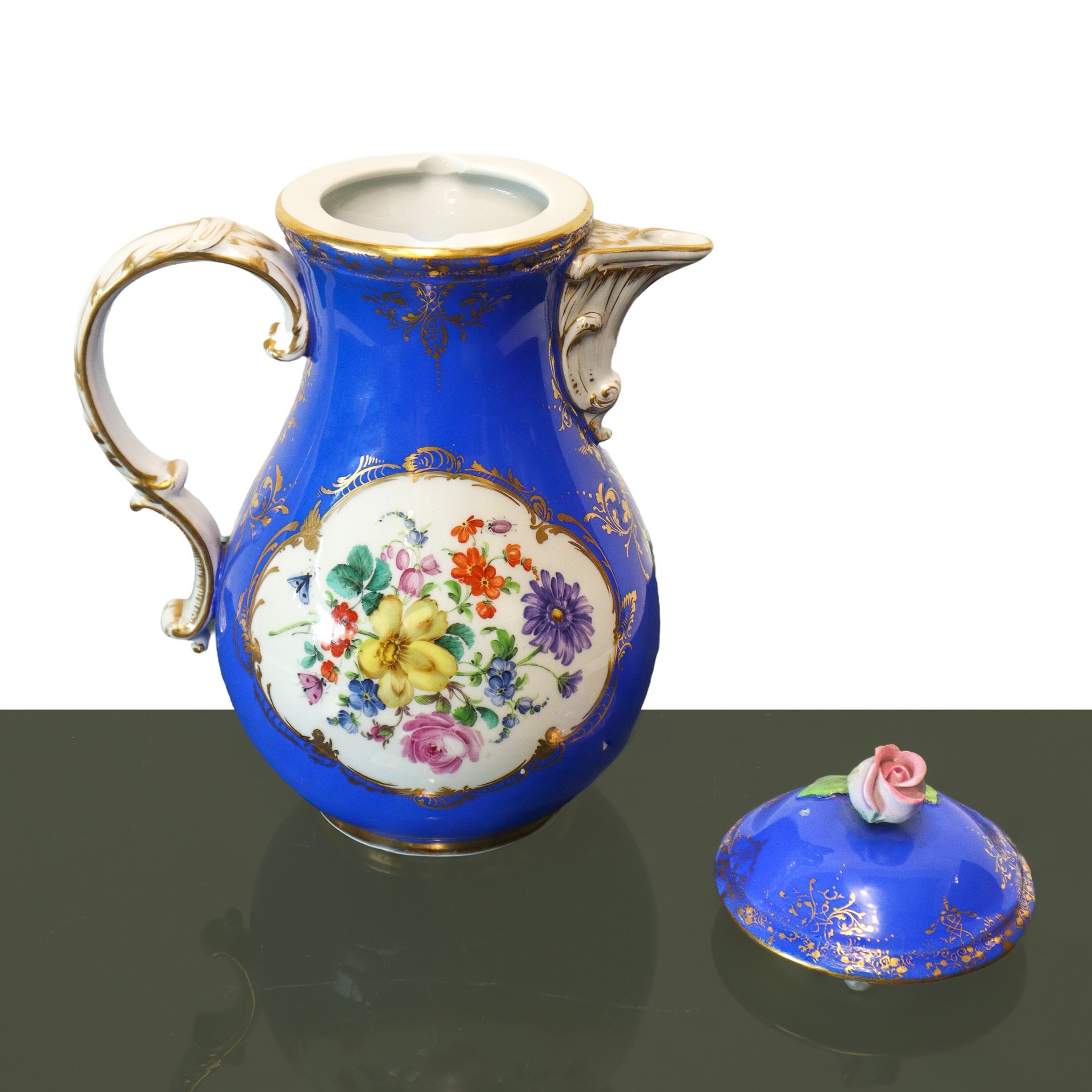 Porcelain Meissen - Caffettiera con fondo blu, presa a sbalzo con porcellana a forma di rosa, dipinta a motivi floreali ambo i lati, decori in oro