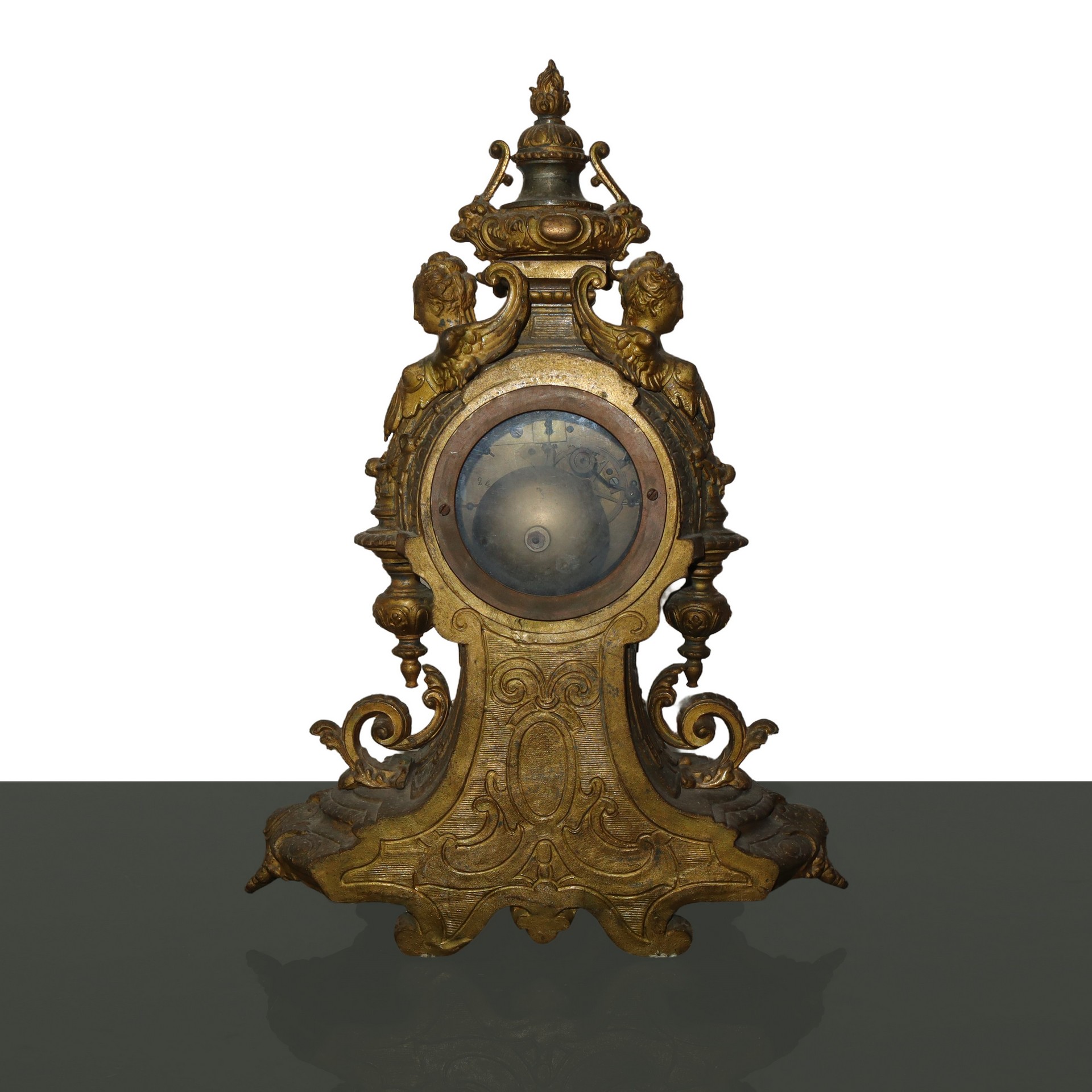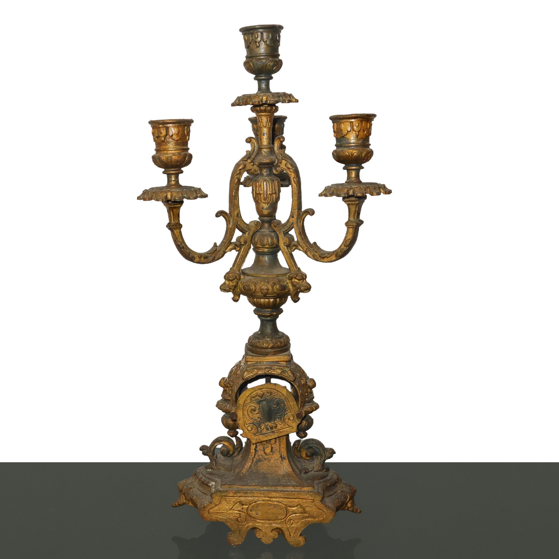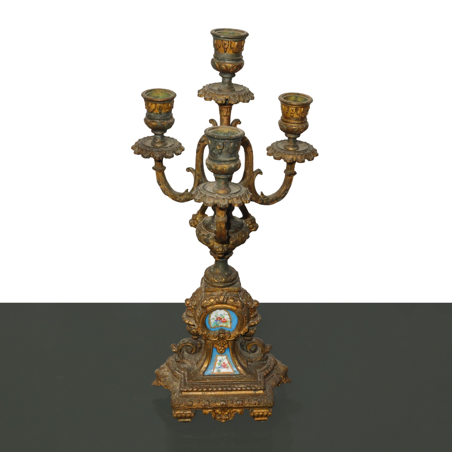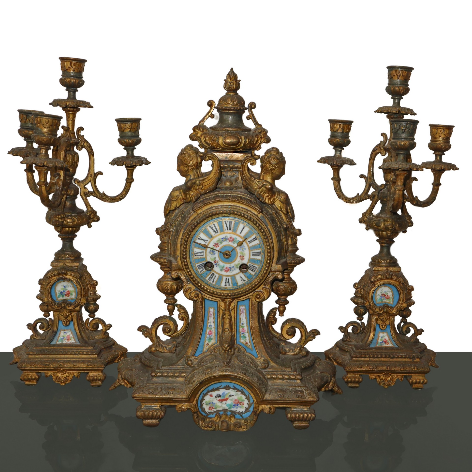 Trittico in bronzo dorato composto da orologio e due candelabri, 19° secolo