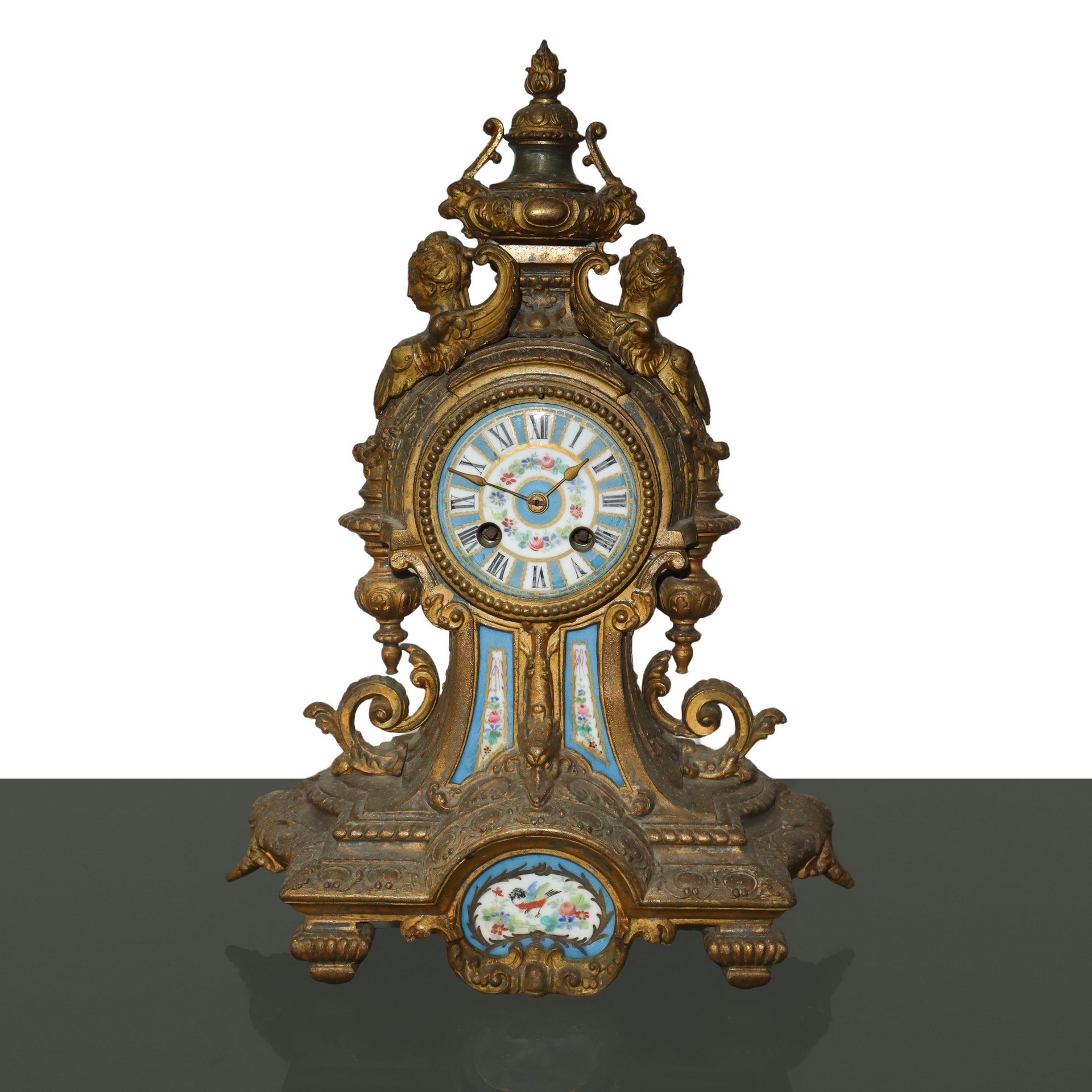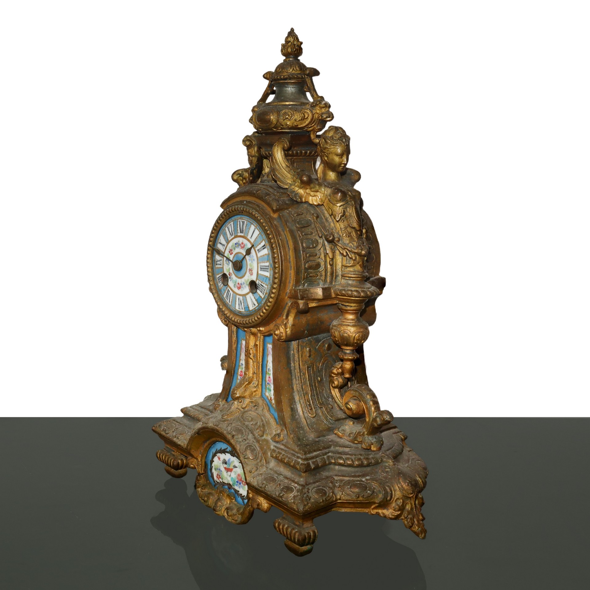 Trittico in bronzo dorato composto da orologio e due candelabri, 19° secolo orologio h cm 40X27 candelabri h cm 41X20 cad Inserti in porcellana di Sevres. Orologio da revisionare.Inserti in porcellana di Sevres. Orologio da revisionare.